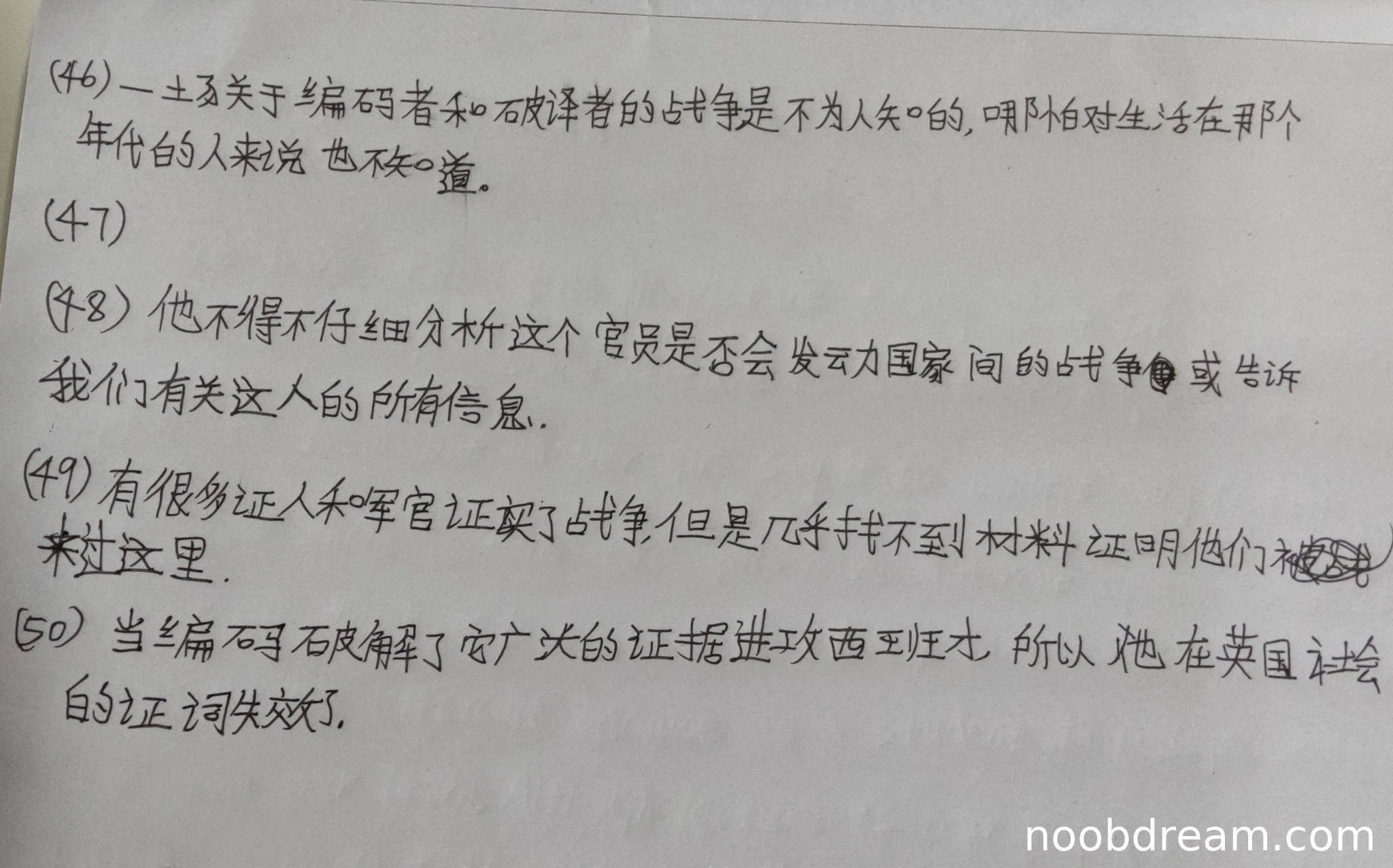 第1次识别:翻译完全无法理解,将"code breaking has its wider relevance in the struggle for Spain"误译为"编码被破解了它广大的证据进攻西王庄才",逻辑完全错误。得0分。
