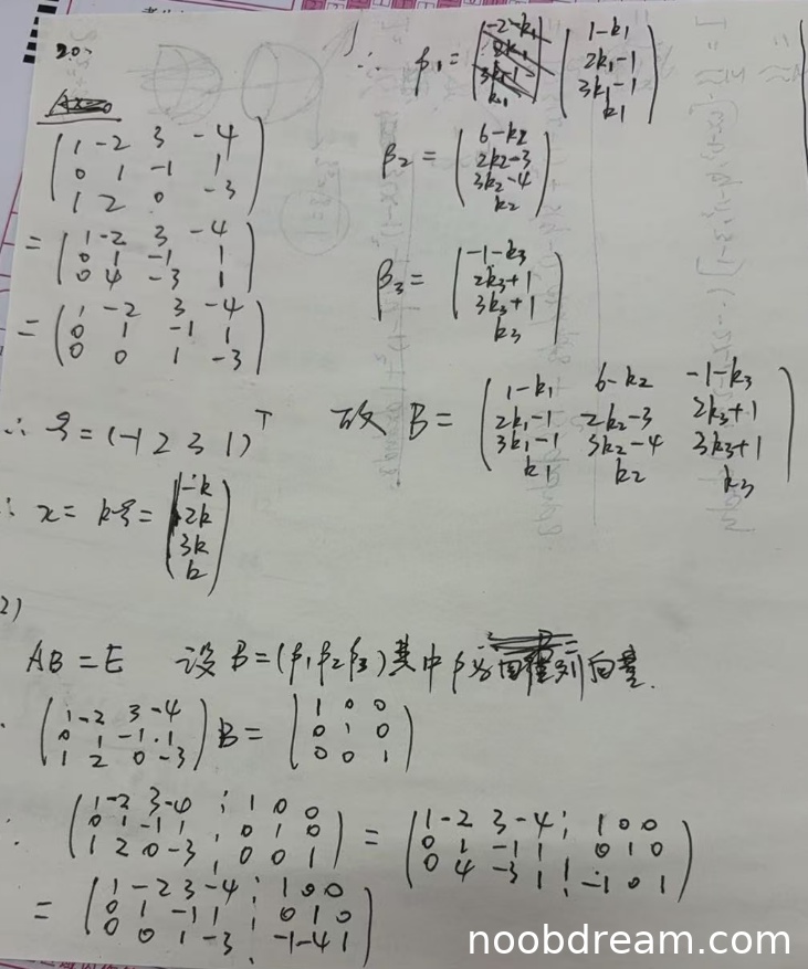 学生正确理解了AB=E的含义,将B按列分块,对增广矩阵进行了正确的行变换,得到了与标准答案方法二相同的思路。最终给出的B矩阵形式为: