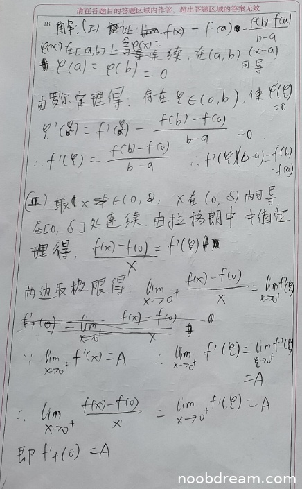 第1次识别结果中存在逻辑错误:在推导过程中出现了"f'(0)"的写法(第3行),这与已知条件不符(题目只给出f(x)在x=0处连续,未说明可导)。第2次识别结果修正了这个错误,正确应用拉格朗日中值定理得到f(x)-f(0)=f'(ξ)x,然后通过极限过程证明f₊'(0)=A。虽然表述上有些不够严谨(如"在[0,δ]处连续"应为"在[0,δ]上连续"),但核心逻辑正确。根据禁止扣分规则,这类表述问题不扣分。得6分。