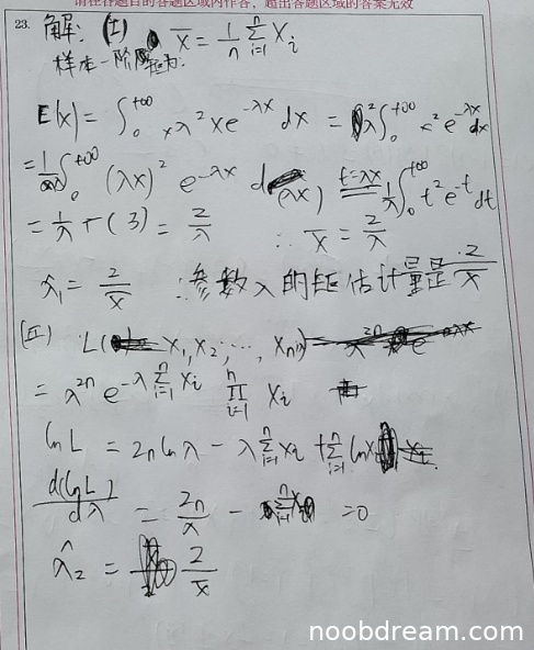 学生正确构建了似然函数 L(λ) = λ²ⁿe^(-λ∑xᵢ)∏xᵢ,取对数后求导,得到最大似然估计量 λ̂ = 2/X̄。虽然在第一次识别中似然函数写成了 λⁿe^(-λ∑xᵢ)∏xᵢ,但后续计算中使用了正确的2n系数,且第二次识别完全正确。根据禁止扣分规则第3条,只要有一次识别正确就不扣分。得满分5.5分。