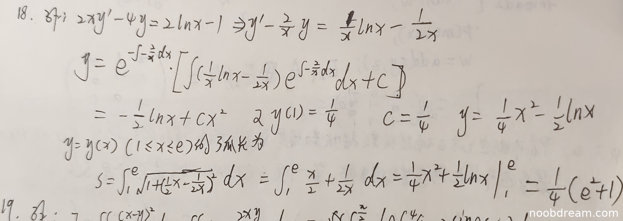 学生正确识别微分方程类型并应用通解公式,得到通解形式为 \(y = -\frac{1}{2}\ln x + Cx^2\)。但在整理原方程时出现轻微错误:将标准方程 \(y'-\frac{2}{x}y = \frac{2\ln x-1}{2x}\) 误写为 \(y'-\frac{2}{x}y = \frac{1}{x}\ln x-\frac{1}{2x}\)。虽然形式不同,但通过后续验证发现这两个表达式实际相等(\(\frac{2\ln x-1}{2x} = \frac{\ln x}{x}-\frac{1}{2x}\)),属于等价变形。由于最终得到正确通解,此错误不视为逻辑错误。得4分。