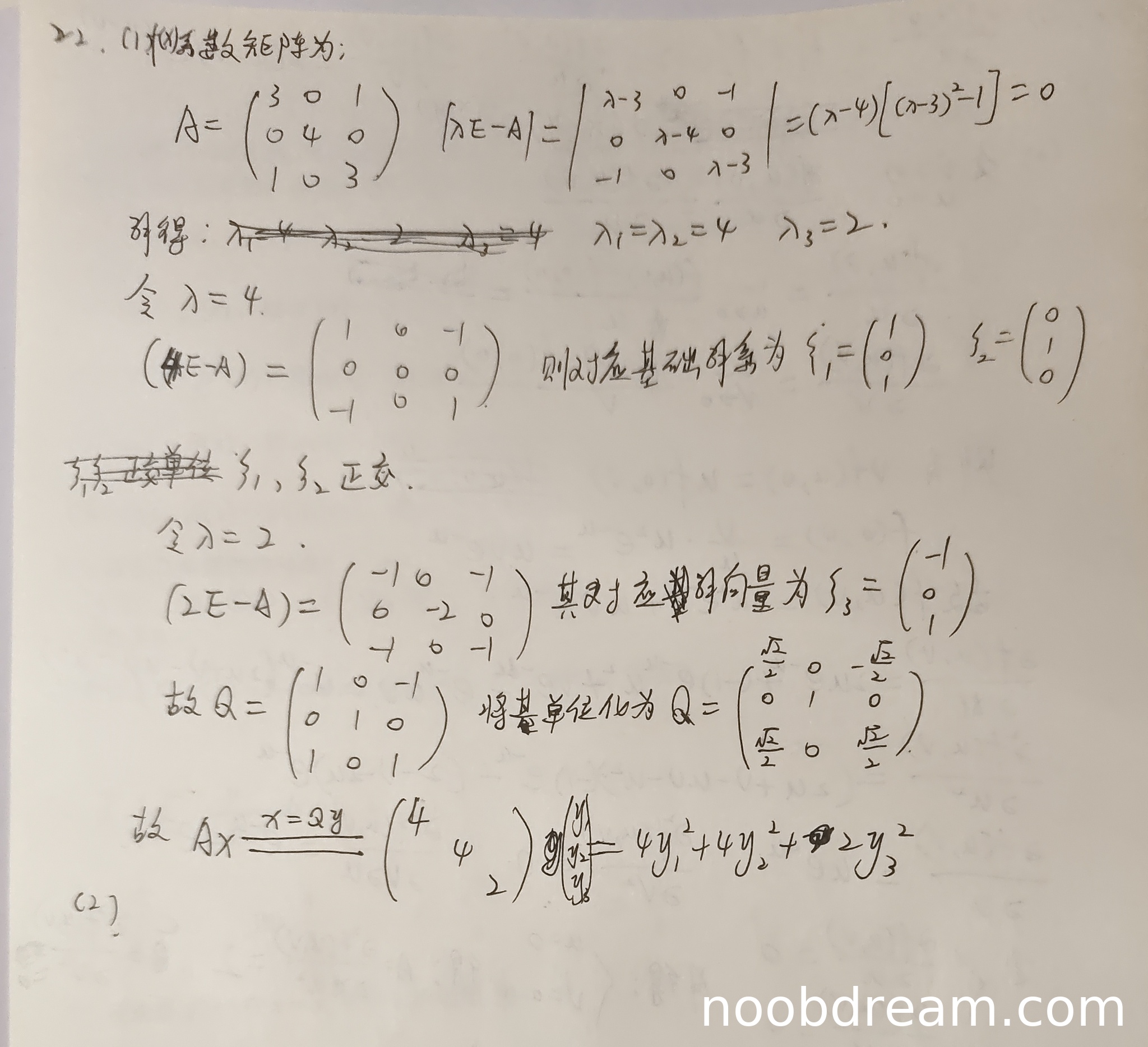 学生正确写出了二次型对应的矩阵A,计算了特征多项式并正确得到特征值λ₁=4, λ₂=4, λ₃=2。求特征向量时,对于λ=4得到了两个线性无关的特征向量ξ₁=(1,0,1)ᵀ和ξ₂=(0,1,0)ᵀ,对于λ=2得到了特征向量ξ₃=(-1,0,1)ᵀ。这些特征向量已经正交,学生进行了单位化得到正交矩阵Q。最后通过正交变换得到了正确的标准形4y₁²+4y₂²+2y₃²。