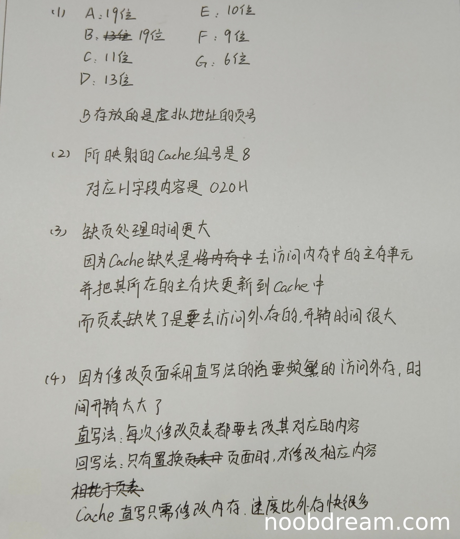 学生正确指出缺页处理时间更大,得1分。解释原因正确(Cache缺失访问主存,缺页访问外存),得1分。本小题得2分。