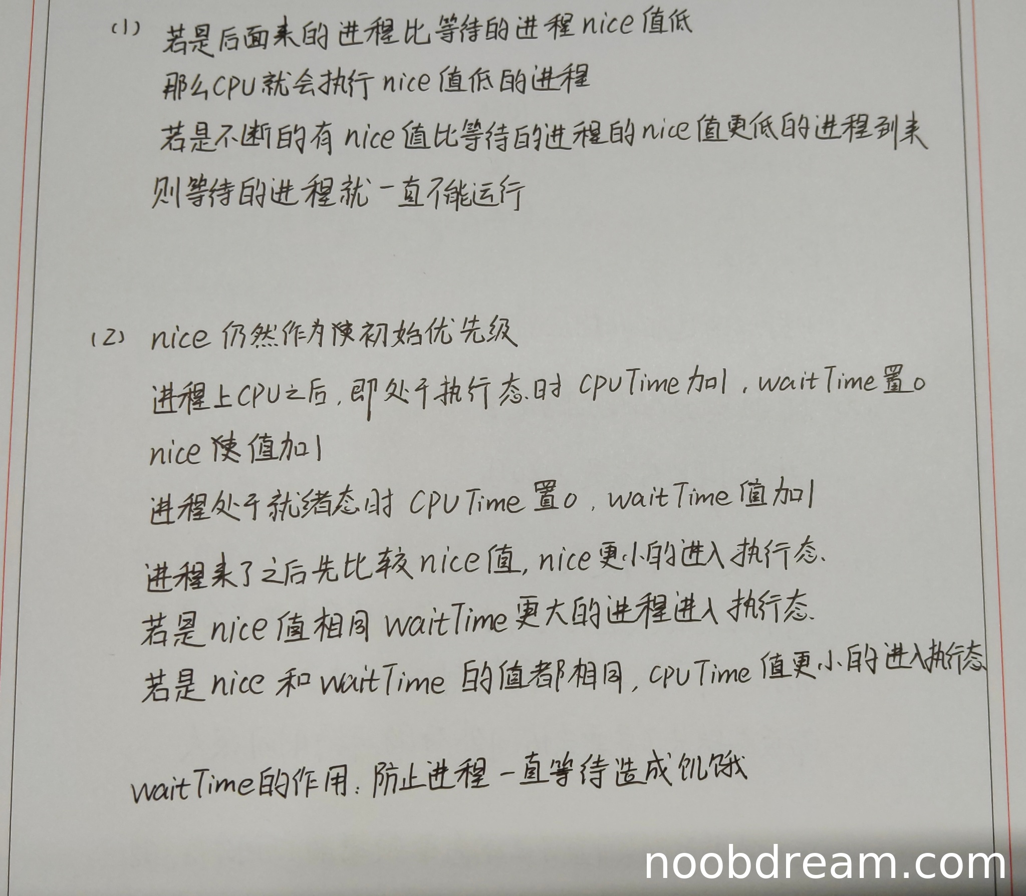 根据评分标准,虽然包含了nice、cpuTime和waitTime三个要素,但由于存在逻辑错误,不能给满分。