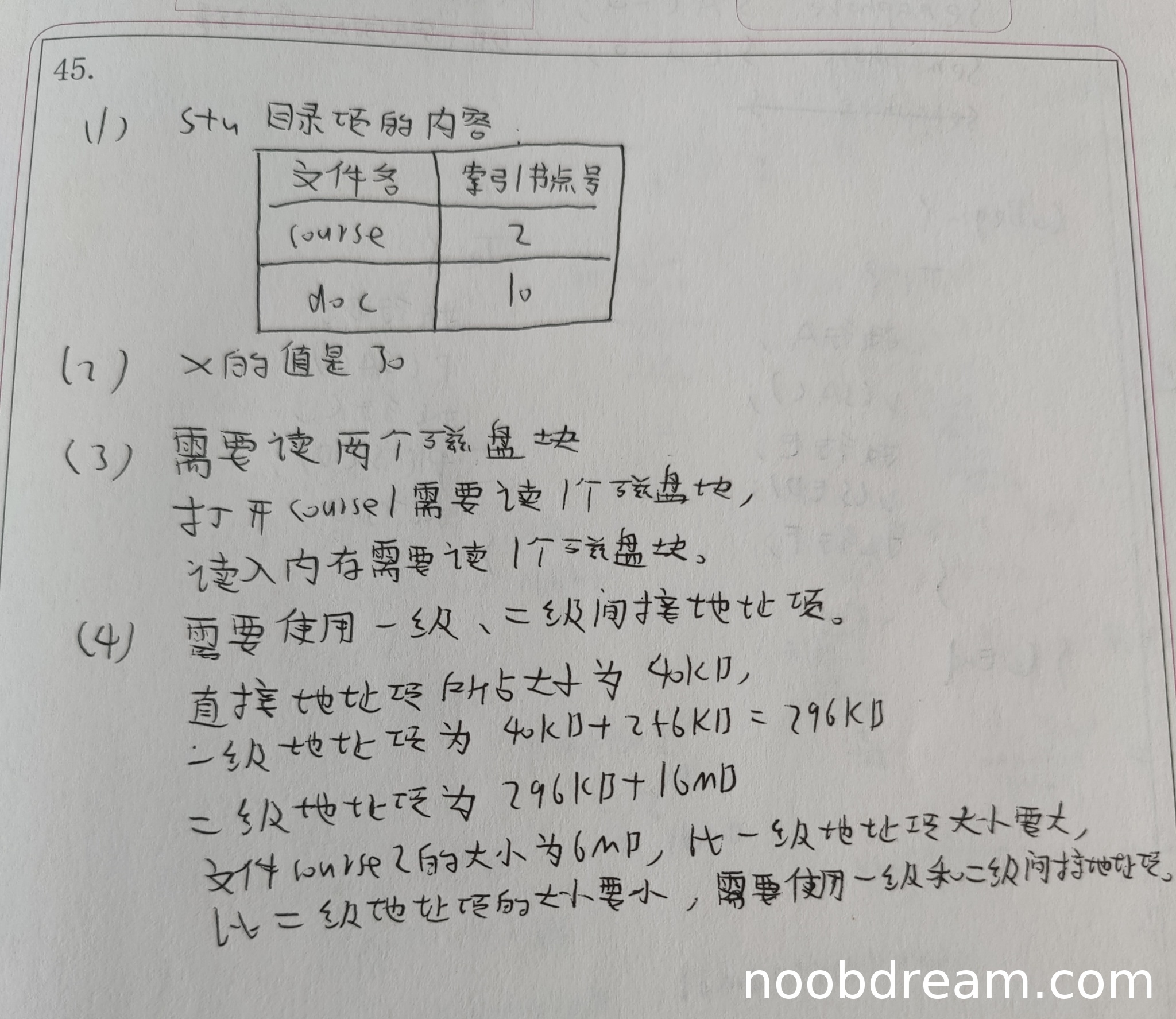 学生回答需要读2个磁盘块,但理由表述不完整且有误。标准答案明确指出需要先读索引节点块,再读数据块。而学生回答"打开course需要读1个磁盘块,读入内存需要读1个磁盘块"表述不准确,没有明确指出是索引节点块和数据块。扣1分,得1分。