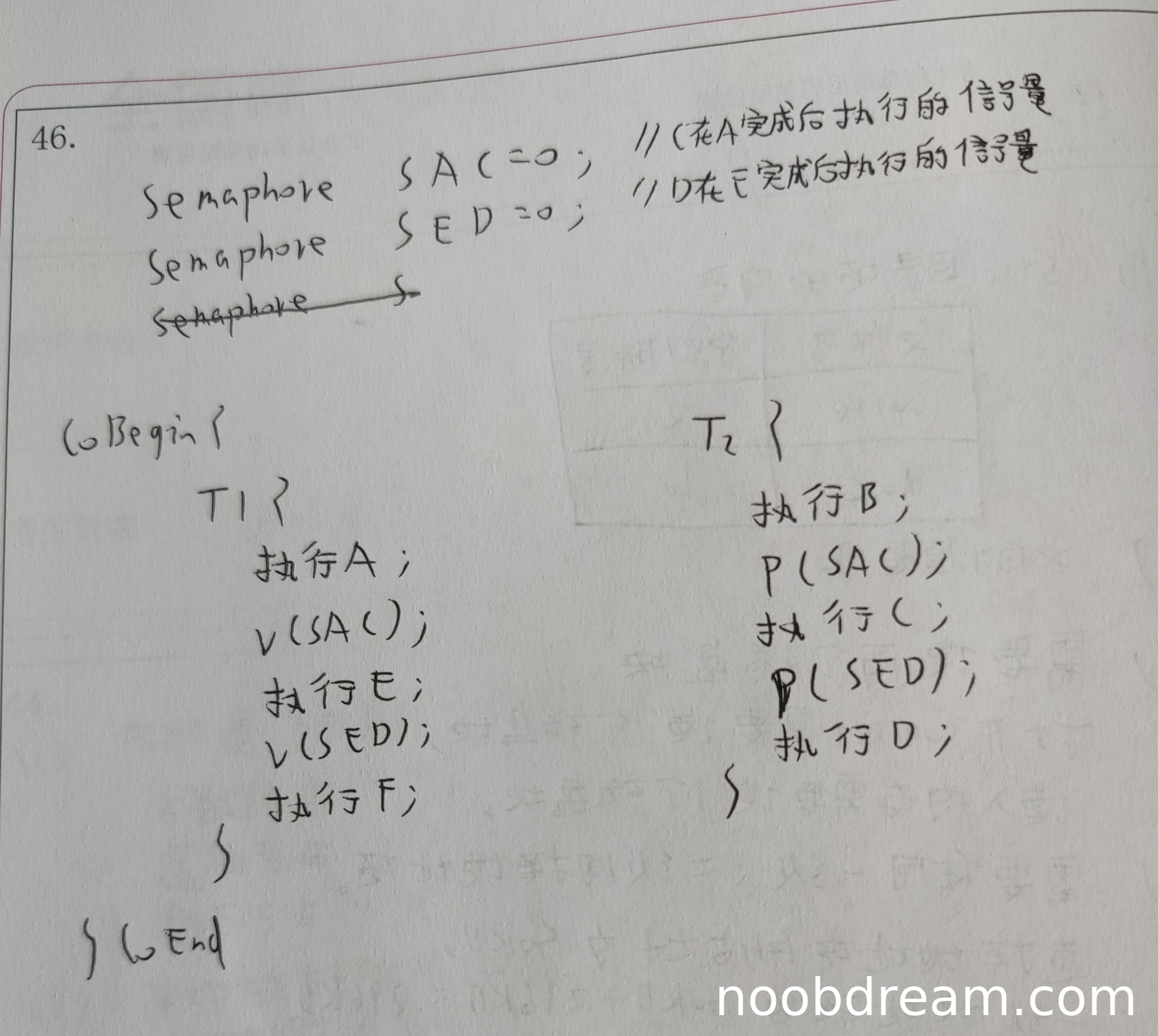 学生定义了SA=0和SED=0两个信号量,但缺少控制C→E同步关系的信号量。SA用于A→C同步正确,但SED用于E→D同步不符合题目要求(题目要求D在C完成后执行,而非E完成后)。此外S未初始化且未使用。信号量定义不完整,扣1分。