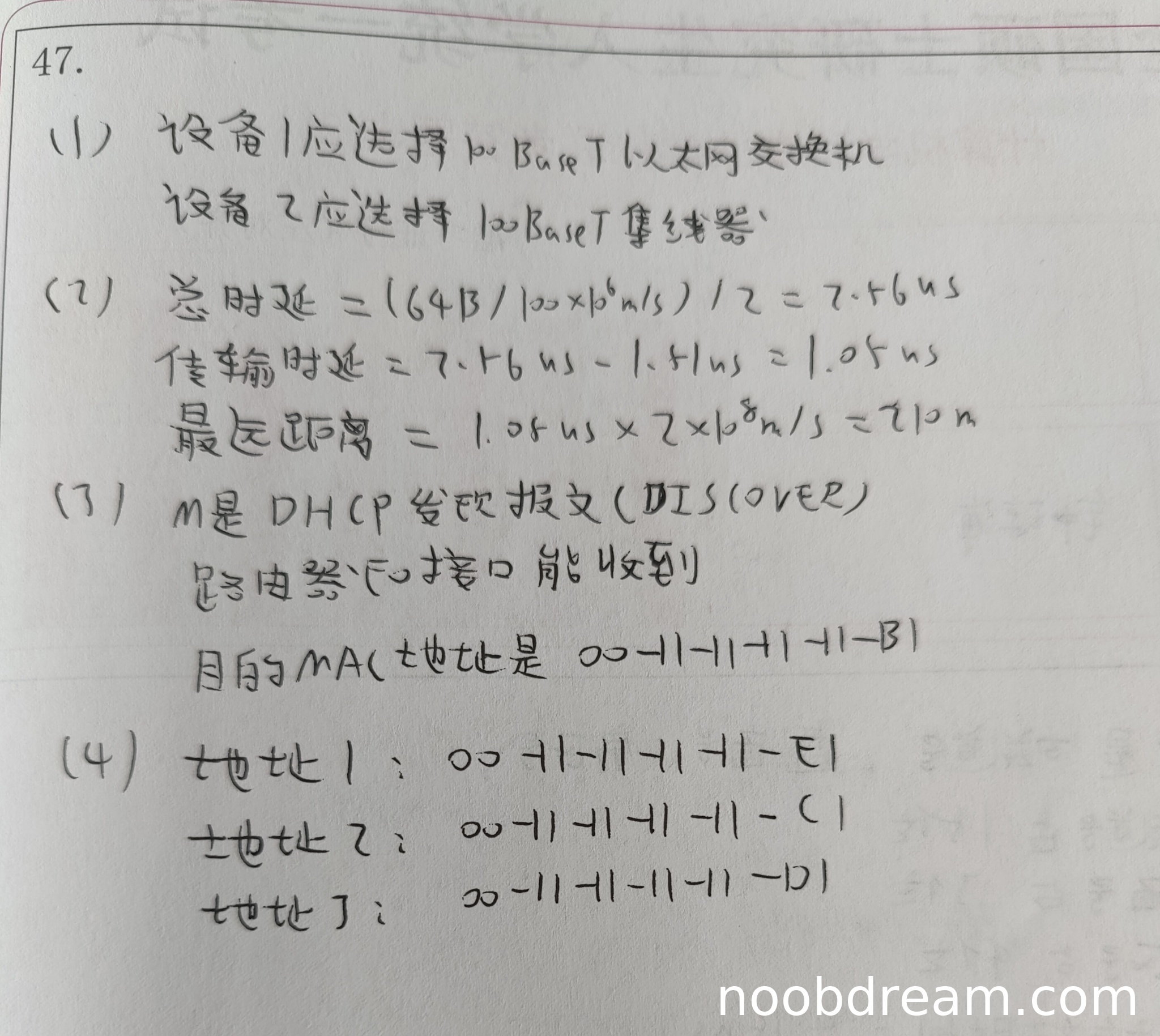 学生正确识别M是DHCP发现报文(DISCOVER),得1分;正确判断路由器接口能收到封装M的以太网帧,得1分;但在目的MAC地址的回答上,两次识别结果都写为"00-11-11-11-11-B1",而标准答案是全1的广播地址。这是逻辑错误,应扣1分。得2分。