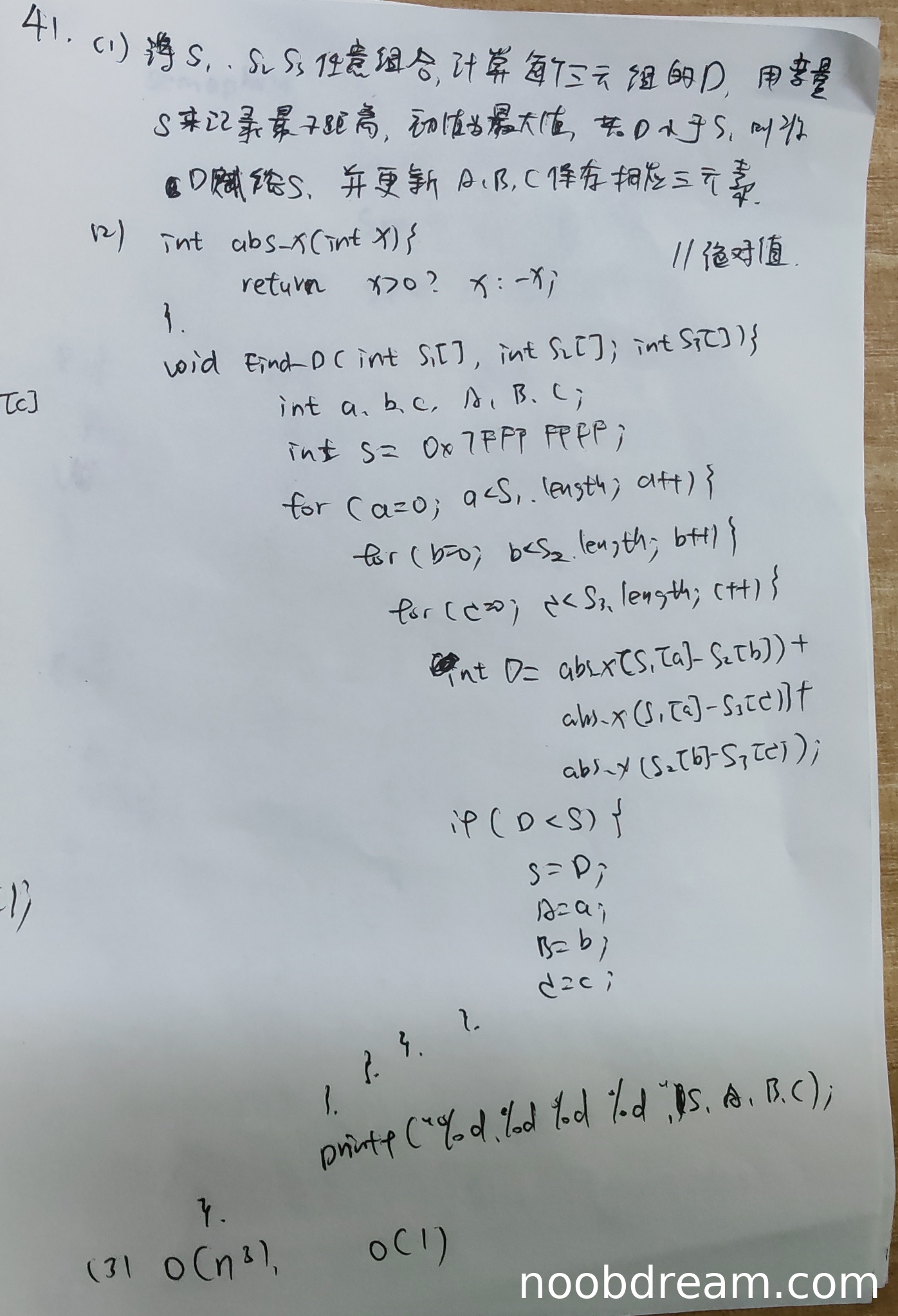 学生实现了暴力枚举的算法,代码结构正确,使用了三重循环遍历所有组合,并正确计算了距离D。但存在以下问题: