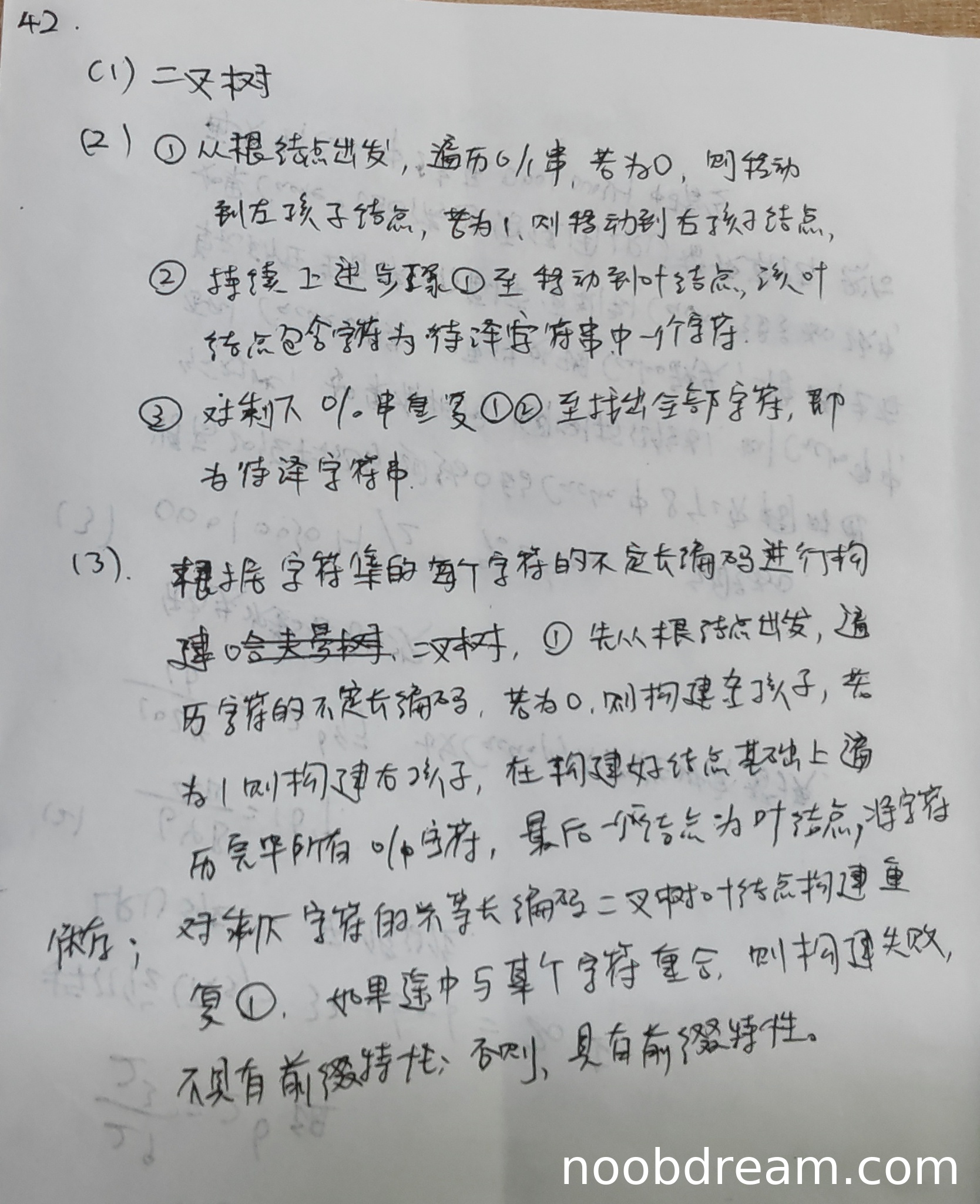 学生描述从根结点出发,根据0/1移动至左/右孩子,直到叶结点输出字符,然后重复过程。这与标准答案完全一致,译码过程描述清晰正确。得3分。