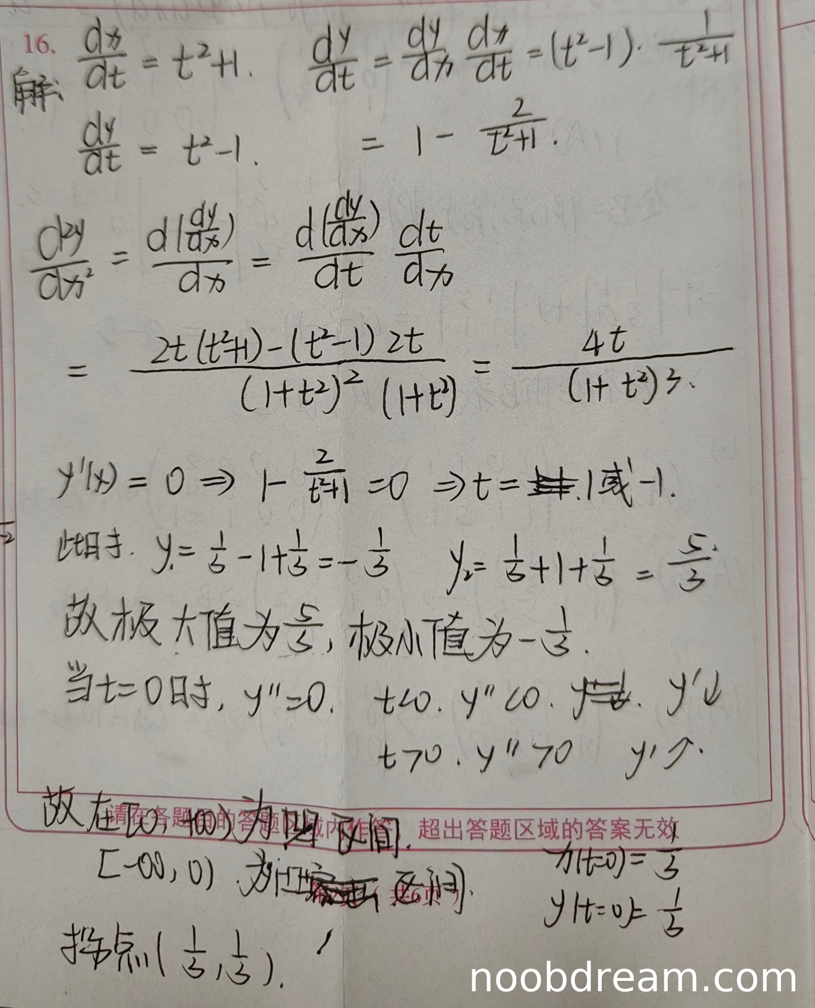 学生找出了驻点 \(t = \pm 1\),但在极值判断中存在逻辑错误:将 \(t=-1\) 对应的 \(y=\frac{5}{3}\) 称为极大值,将 \(t=1\) 对应的 \(y=-\frac{1}{3}\) 称为极小值,这与标准答案的极值点坐标完全相反。根据参数方程,当 \(t=-1\) 时 \(y=1\),当 \(t=1\) 时 \(y=-\frac{1}{3}\),学生计算错误。扣2分,得1分。