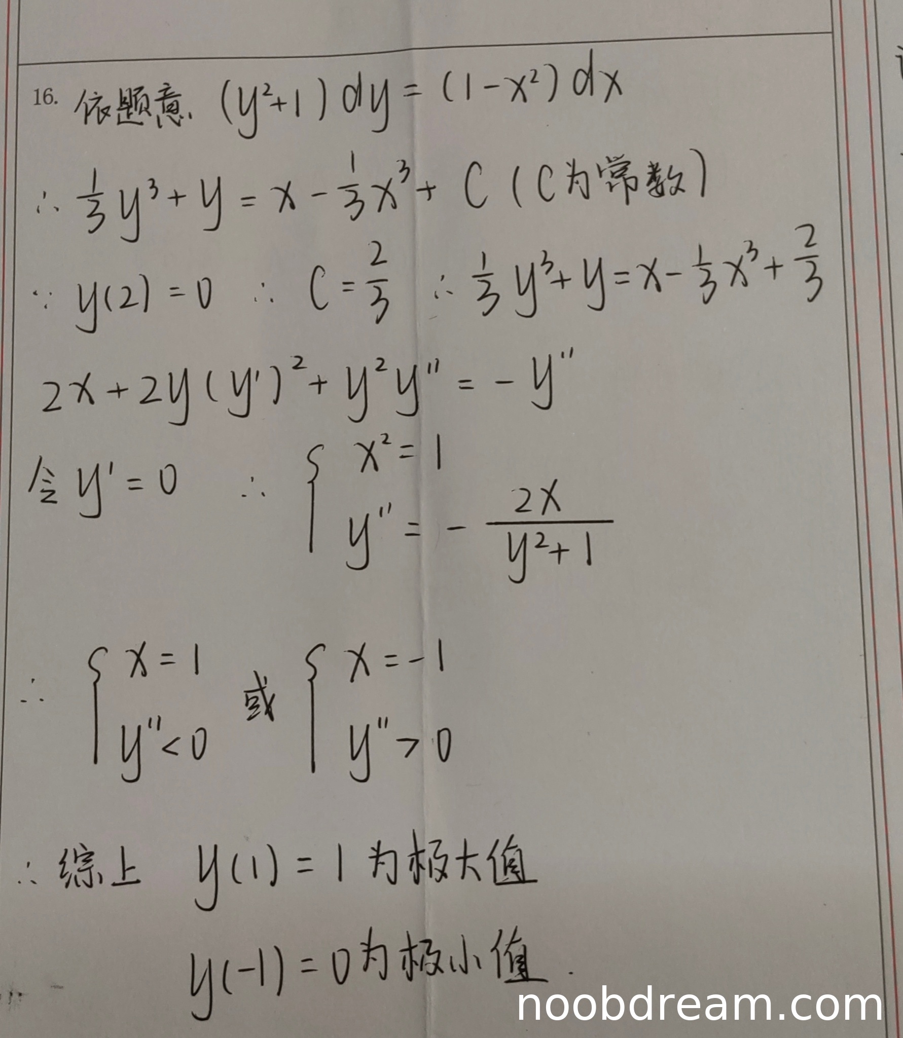 学生通过原方程推导出 \(y'=\frac{1-x^2}{y^2+1}\)(在第二次识别中体现),并正确得出当 \(y'=0\) 时 \(x=\pm 1\)。但在第一次识别中,学生错误地使用了二阶导数方程 \(2x+2y(y')^2+y^2y''=-y''\) 来求驻点,这是不必要的且逻辑错误。由于第二次识别中正确使用了 \(y'=0\) 的条件,且根据上下文判断第一次识别中的错误可能是误写,因此不扣分。得3分。