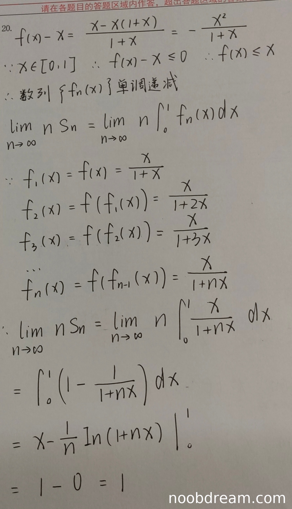- 正确推导出 \(f_n(x) = \frac{x}{1+nx}\) 的表达式