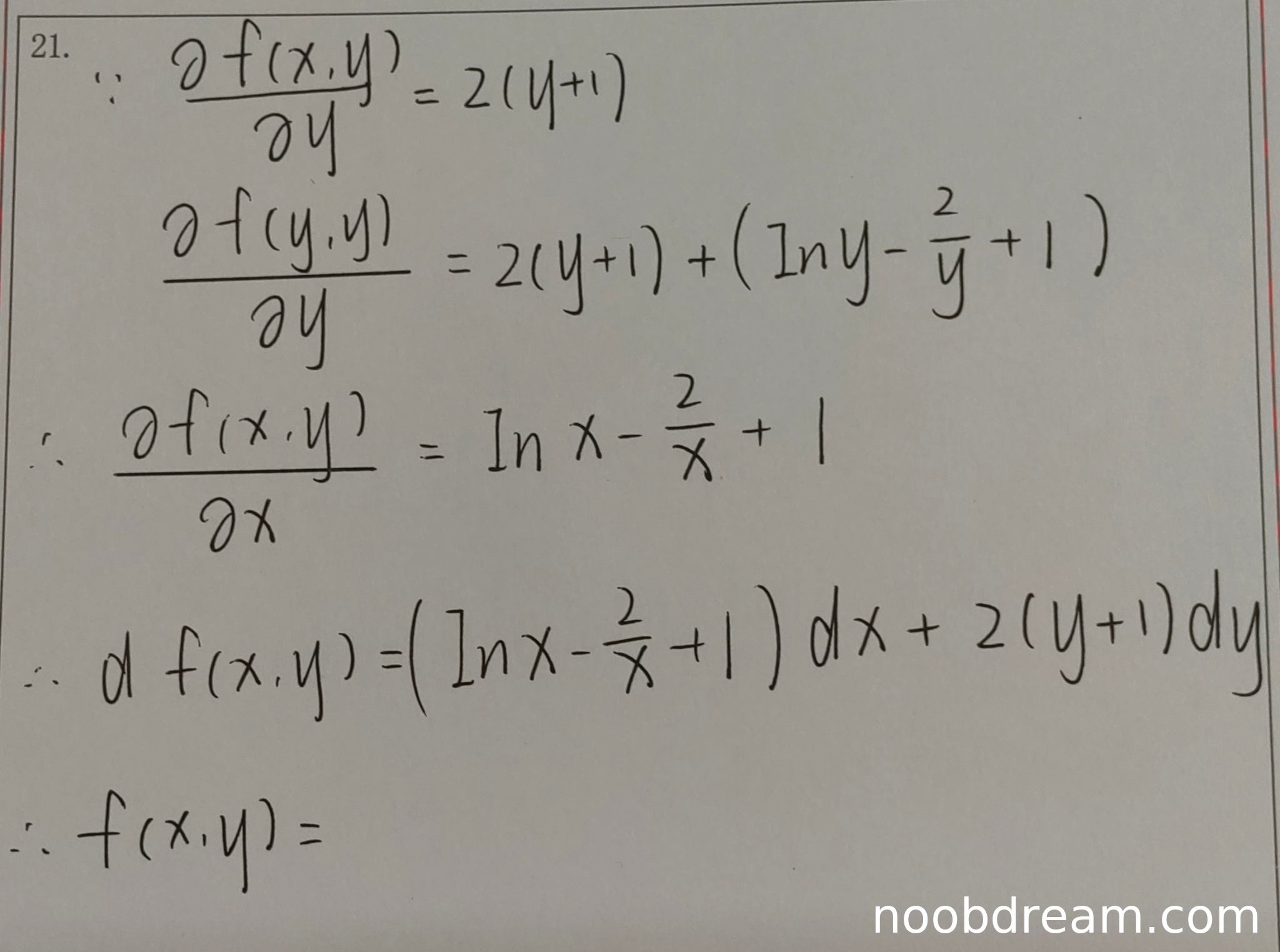 - 学生给出了全微分形式 \(df(x,y) = (\ln x - \frac{2}{x} + 1)dx + 2(y+1)dy\),但基于错误的偏导数,因此全微分也不正确。