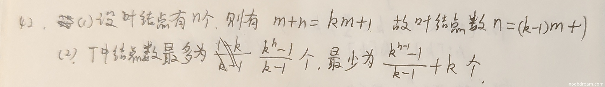 学生正确推导了叶结点数量的公式:设叶结点数为n,根据结点总数m+n等于边数km+1,得到n=(k-1)m+1。推导过程与标准答案一致,逻辑正确。得3分。