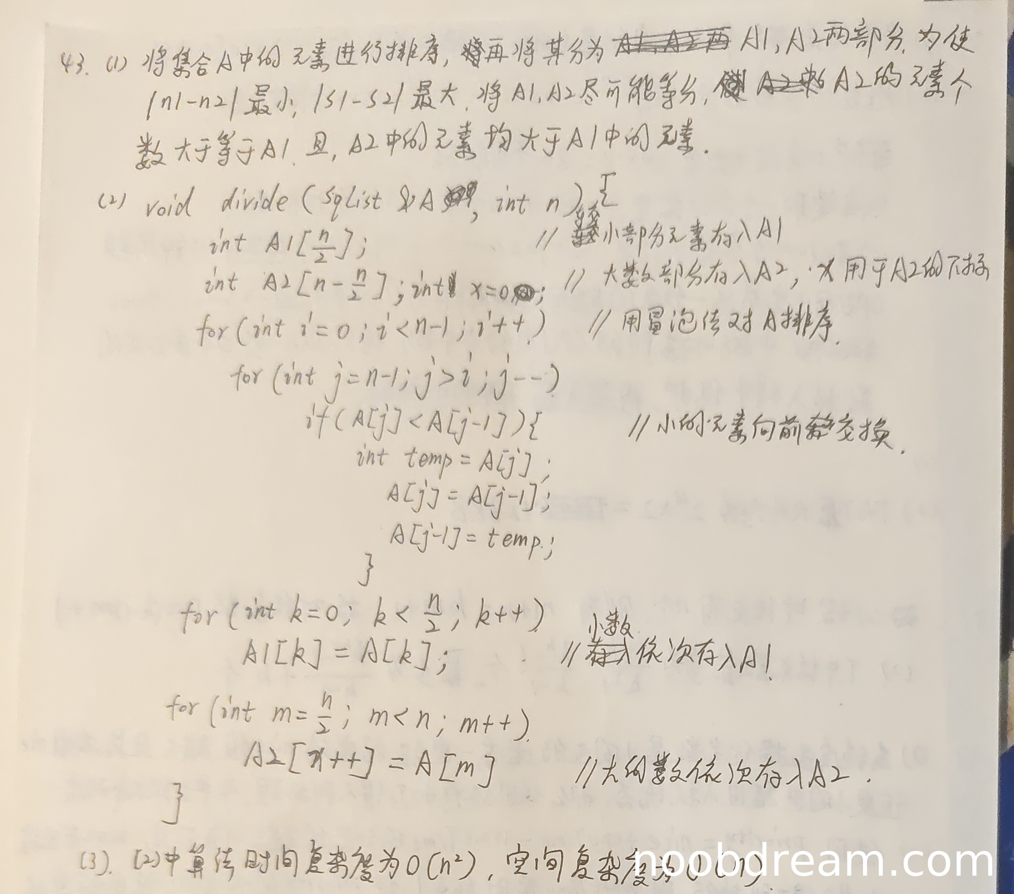 理由:时间复杂度分析正确为O(n²),但空间复杂度分析有误。学生第二次识别结果说空间复杂度为O(1),但实际上代码中创建了两个数组A1和A2,总空间为O(n),因此扣1分。