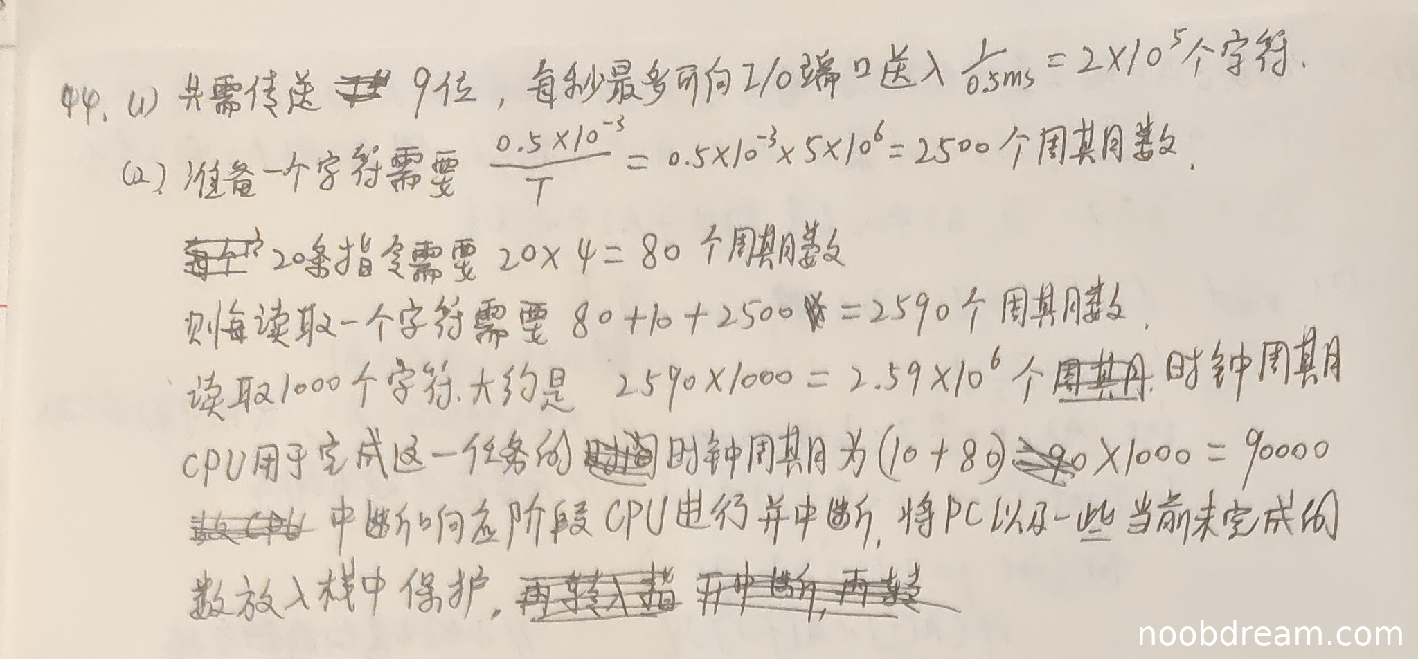 学生第一问回答每传送一个字符需要9位,但标准答案为10位(包括起始位1位、数据位7位、奇校验位1位、停止位1位)。学生漏算了起始位,属于逻辑错误,扣1分。第二问计算每秒最多可传送字符数,学生计算为2×10⁵个,但标准答案为2000个。学生错误地将0.5ms转换为秒后取倒数,得到错误结果,属于逻辑错误,扣1分。本小题共扣2分,得1分。