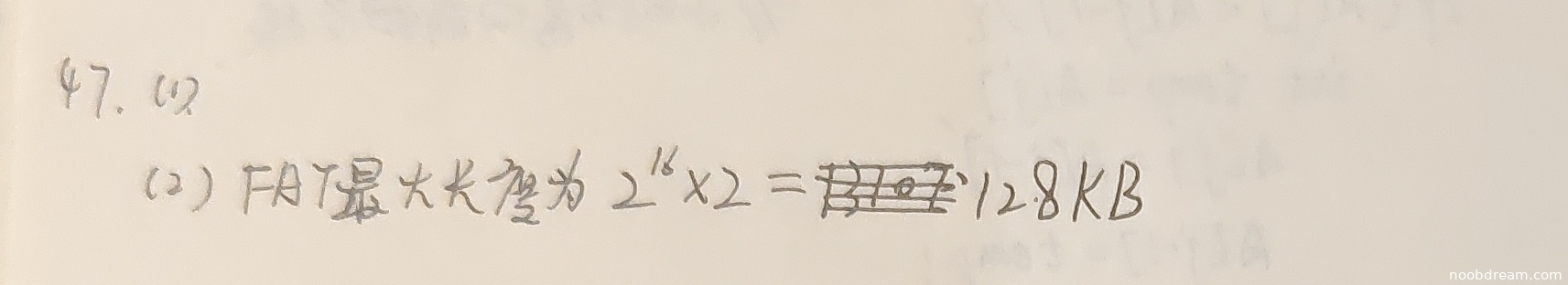 学生正确计算出FAT最大长度为128KB(2¹⁶×2B=128KB),得1分。但未回答文件最大长度,因此扣1分,最终得1分。