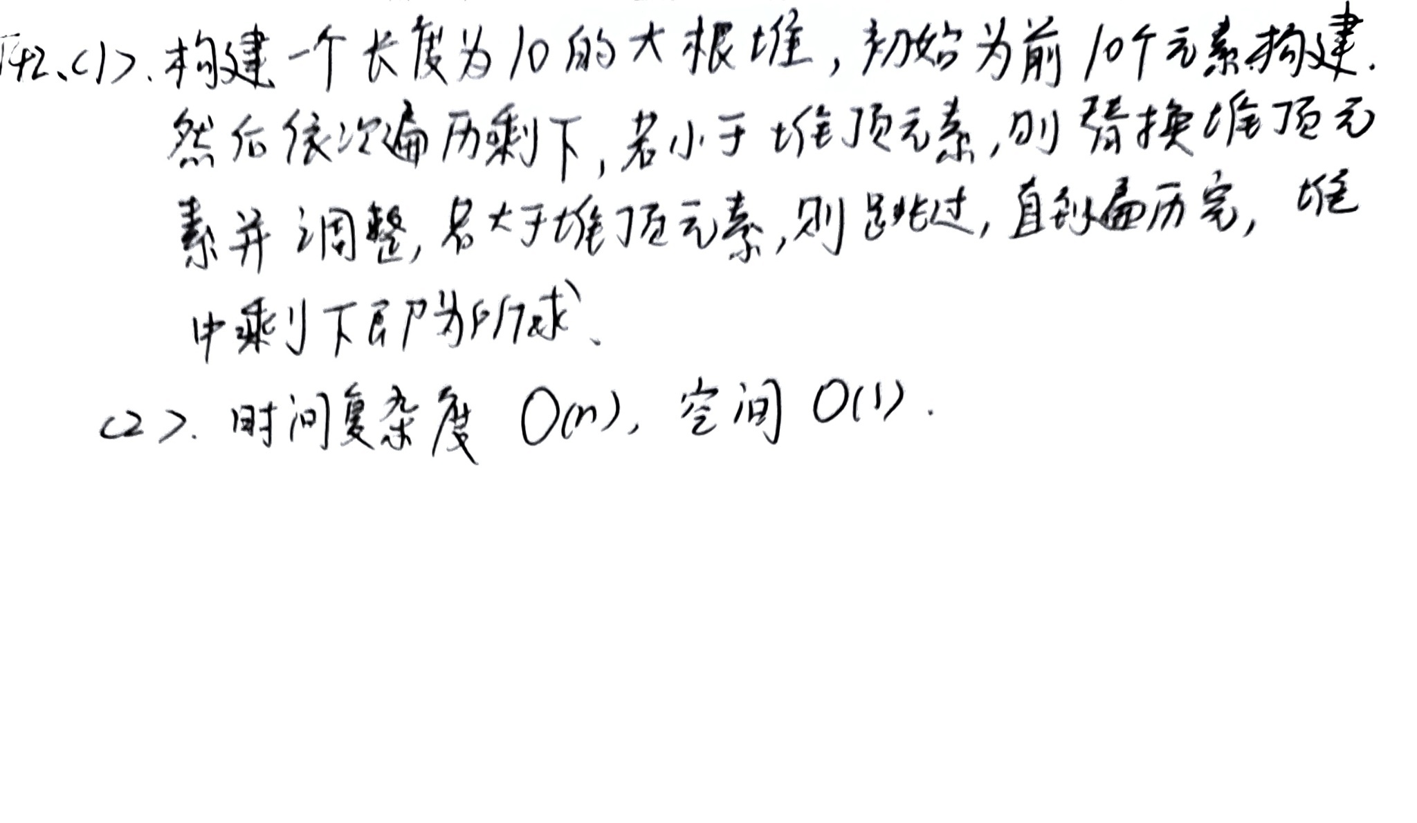 学生答案描述了一种使用大根堆来查找最小10个数的算法。算法思想正确:先构建长度为10的大根堆,然后遍历剩余元素,若小于堆顶则替换并调整堆。这与标准答案中的方法二一致,思路正确且描述清晰。因此得5分。