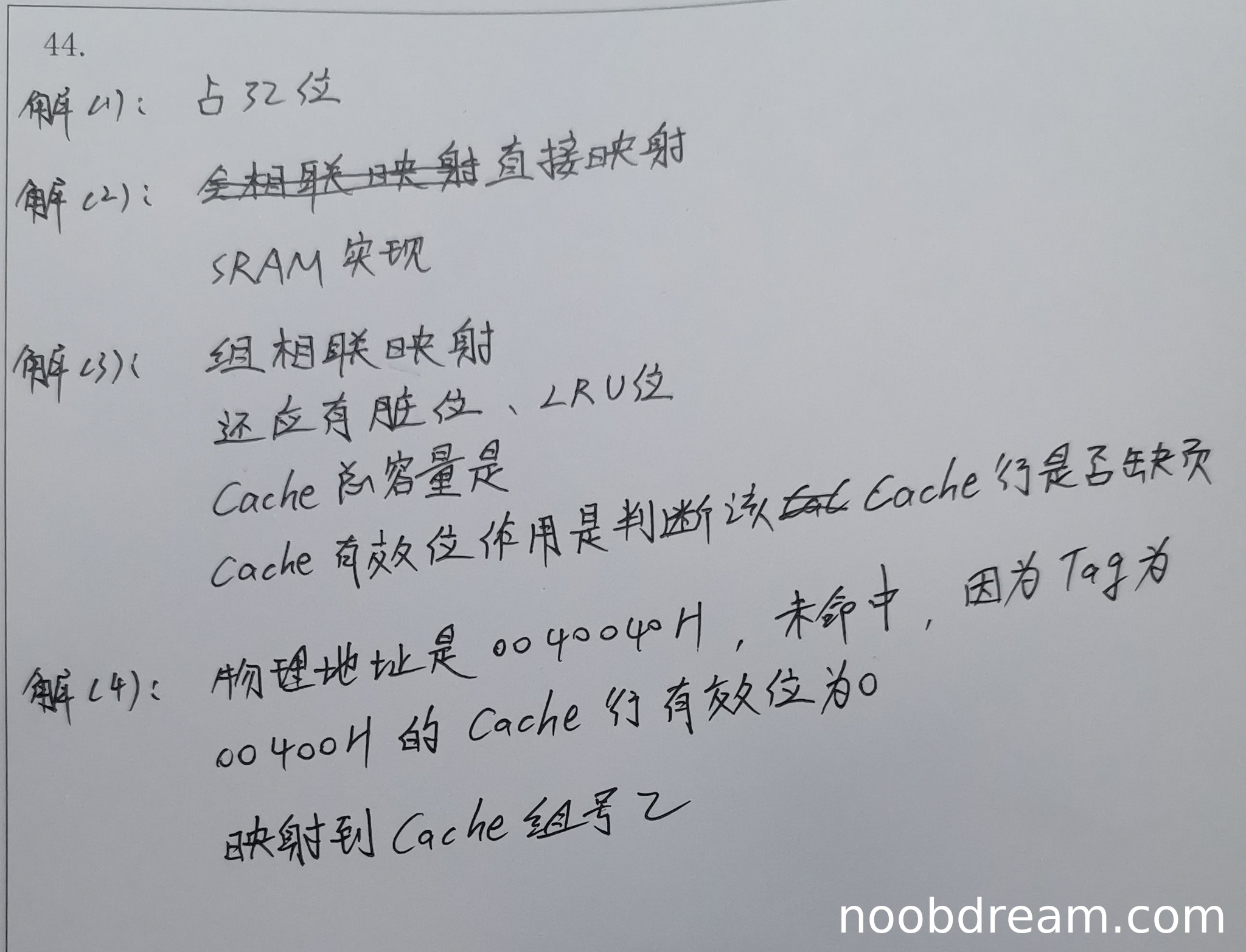 第一问:学生回答“物理地址是0040040H”正确,得1分。第二问:学生回答“未命中,因为Tag为00400H的Cache行有效位为0”正确,得2分。第三问:学生回答“映射到Cache组号2”错误,标准答案为组号3(虚拟地址0007C260H低12位260H=0010 0110 0000B,组号为中间3位011B=3),属于计算错误,扣2分。本小题总分:3分(物理地址1分 + 未命中理由2分 - 组号错误扣2分)。