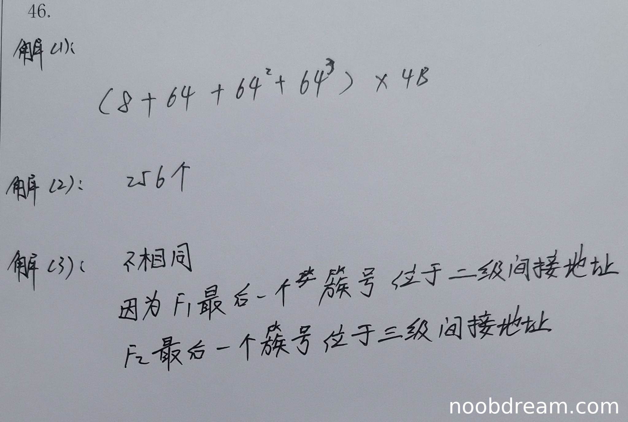 评分理由:学生答案存在多处逻辑错误。首先,每簇地址项数量应为4KB/4B=1024,但学生使用了64;其次,最后乘的是48而不是4KB(4096B)。这两个错误导致计算表达式完全错误。因此扣2分。