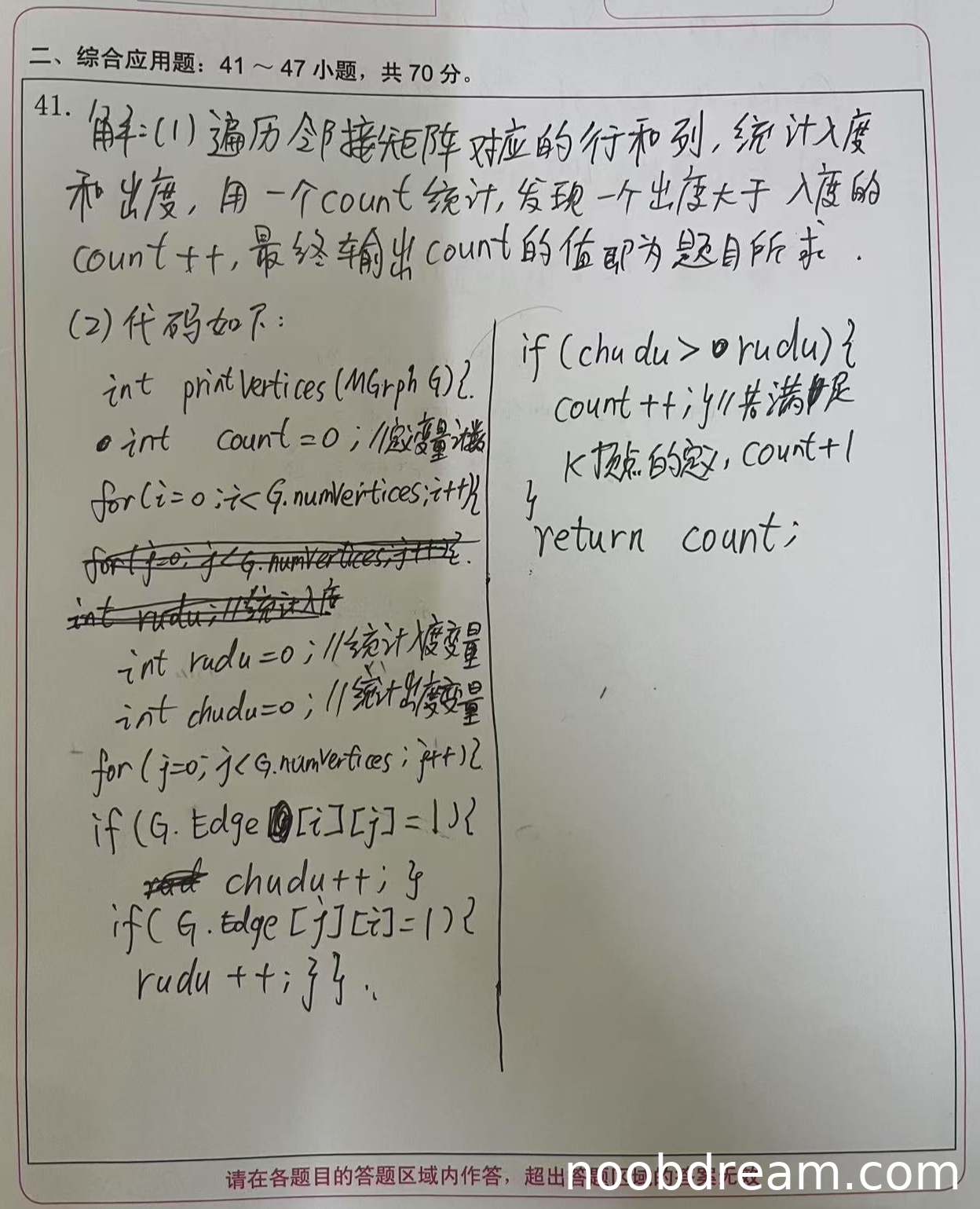 理由:代码逻辑基本正确,能够正确计算每个顶点的入度和出度,并统计满足条件的顶点个数。但存在以下问题: