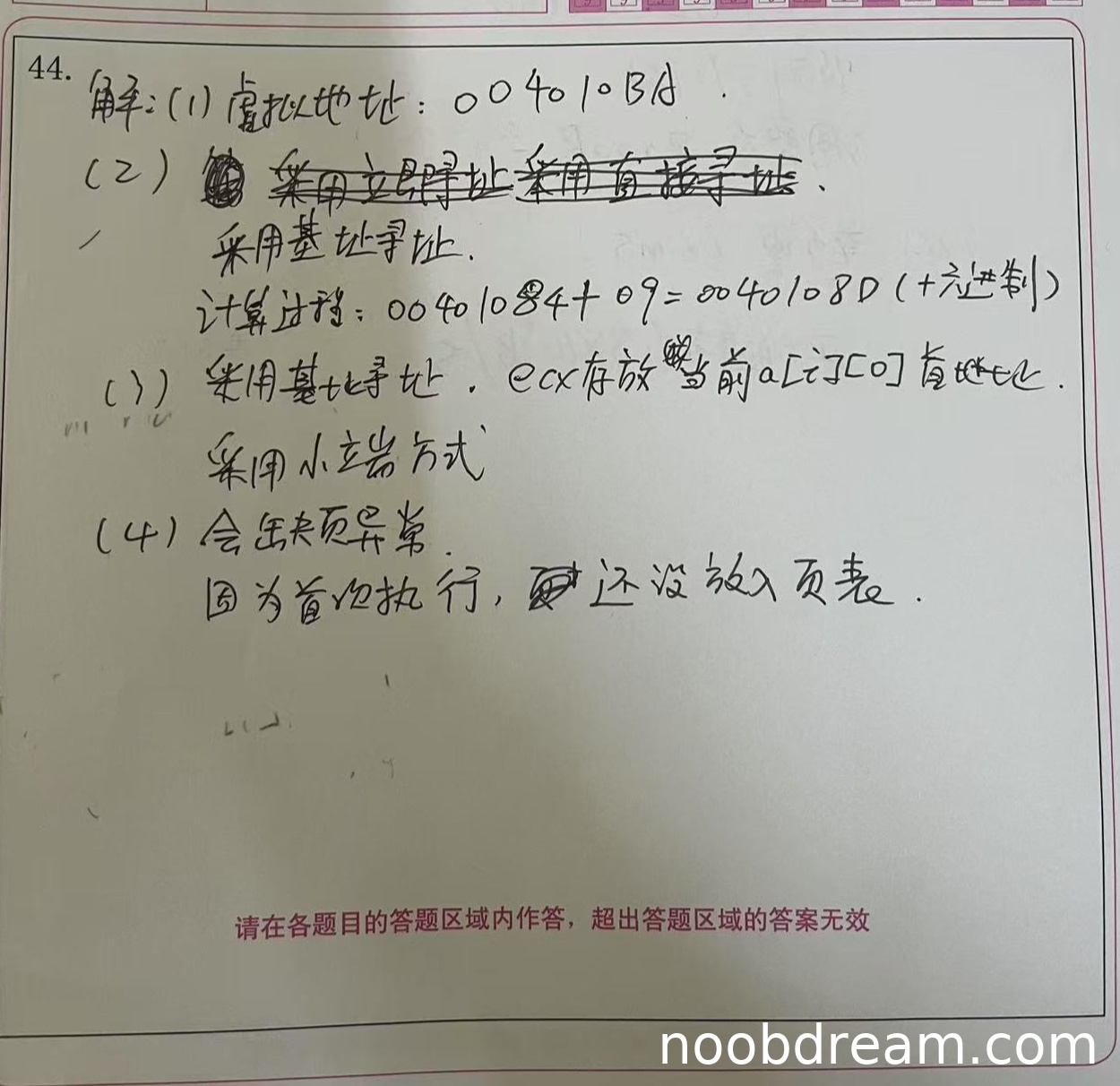 第一问:学生回答"基址寻址"错误,源操作数应为立即寻址,扣1分。第二问:ecx存放内容回答不准确,标准答案为i×256,学生回答"当前address地址"或"a[i][0]首地址"不准确,但有一定合理性,不扣分。第三问:小端方式回答正确,得1分。本小题总计得1分。