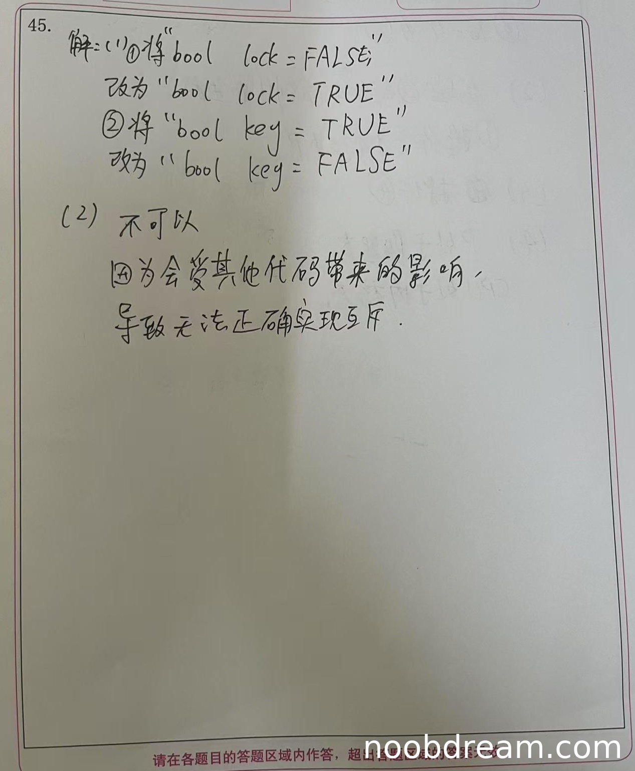 学生答案中提出了两处修改:①将"bool lock = FALSE"改为"bool lock = TRUE";②将"bool key = TRUE"改为"bool key = FALSE"。这些修改不符合标准答案的要求。标准答案要求将"if (key == TRUE) swap key, lock;"改为"while (key == TRUE) swap key, lock;",并将"lock = TRUE;"改为"lock = FALSE;"。学生的修改没有解决关键问题:没有将条件判断改为循环等待,且修改初始值会导致逻辑错误(例如,初始lock为TRUE时线程无法进入临界区)。因此,这两处修改均不正确,无法实现互斥。扣4分。