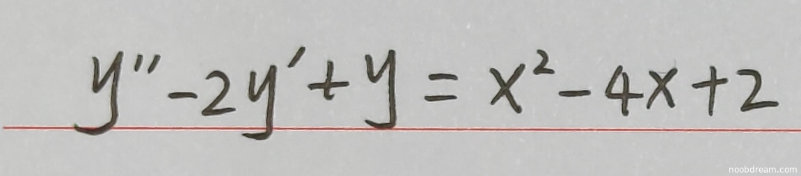 学生两次识别结果均为 \(y'' - 2y' + y = x^2 - 4x + 2\),而标准答案为 \(y' - y = 2x - x^2\)。从阶数上看,学生给出的是二阶微分方程,而题目要求是一阶非齐次线性微分方程,存在阶数错误。根据逻辑错误扣分原则,该答案不符合题目基本要求,故得0分。