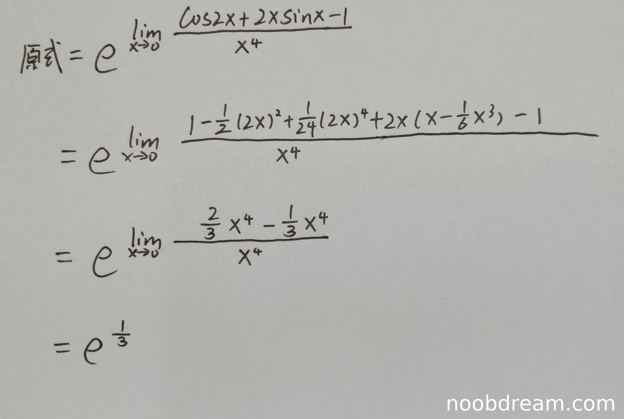 学生作答整体思路正确,使用了指数化方法将原极限转化为指数形式,然后通过泰勒展开计算指数部分的极限。具体步骤中: