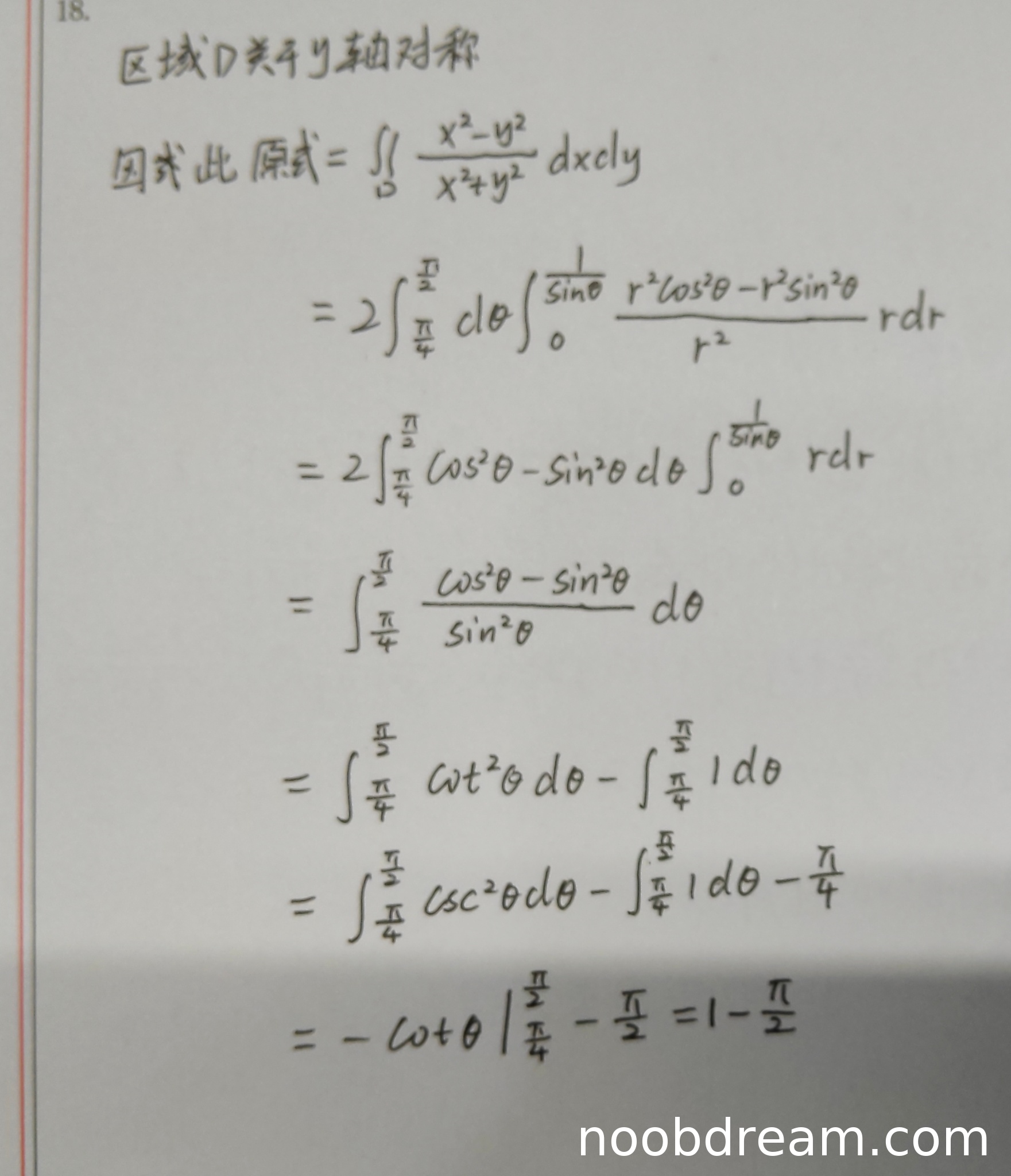 学生作答使用了极坐标变换的方法,与标准答案方法不同但思路正确。首先利用区域关于y轴对称的性质,正确指出被积函数中的xy项积分为0,从而化简为对(x²-y²)/(x²+y²)的积分。然后正确转换为极坐标,确定θ范围为[π/4, π/2],r范围为[0, 1/sinθ]。计算过程中: