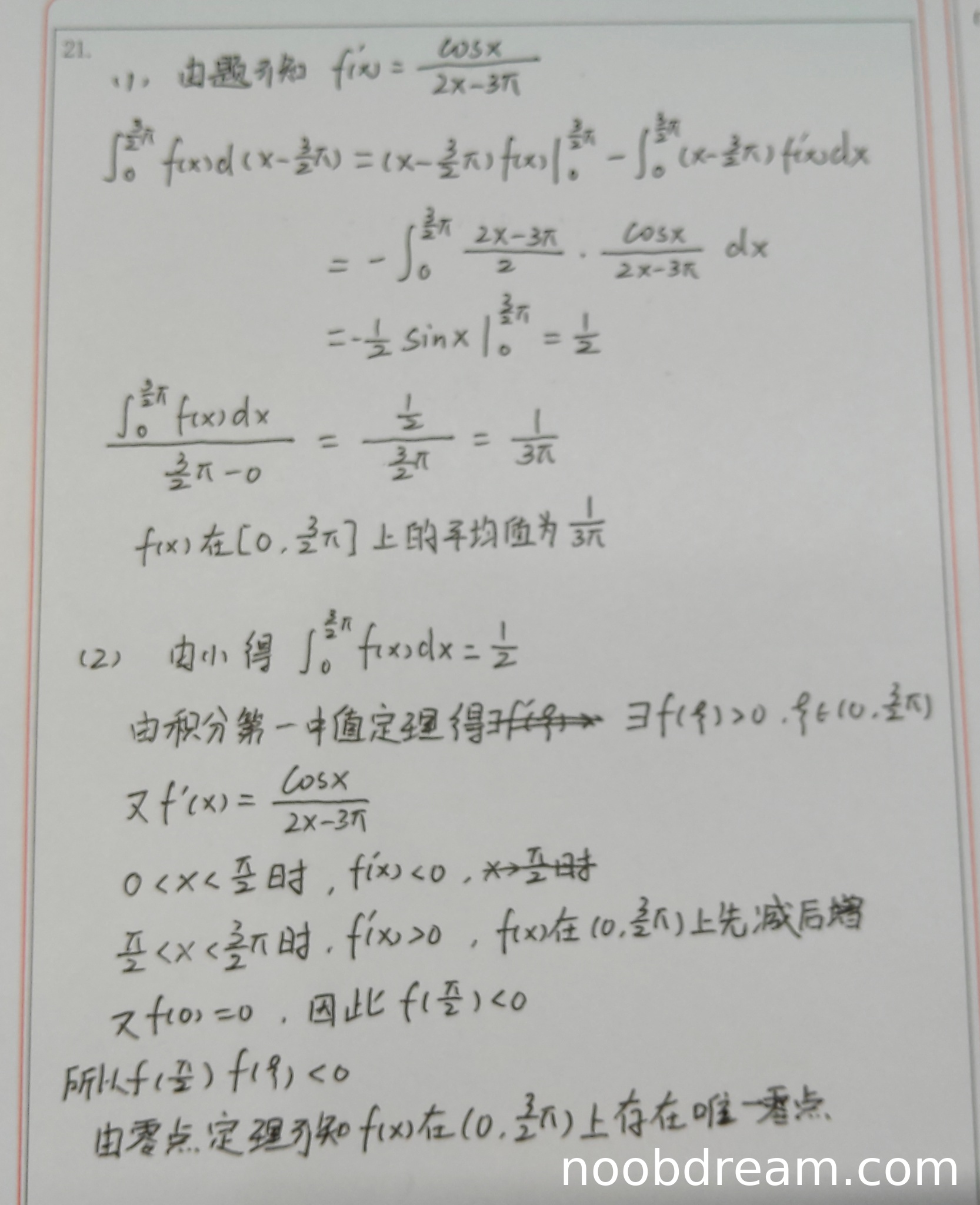 第(2)问满分应为5.5分。学生正确求导 \( f'(x) = \frac{\cos x}{2x-3\pi} \),分析单调性:在 \( (0,\frac{\pi}{2}) \) 上 \( f'(x)<0 \)(递减),在 \( (\frac{\pi}{2},\frac{3\pi}{2}) \) 上 \( f'(x)>0 \)(递增),得出 \( x=\frac{\pi}{2} \) 为极小值点且 \( f(\frac{\pi}{2})<0 \)(因 \( f(0)=0 \) 且递减)。利用积分第一中值定理,由 \( \int_{0}^{3\pi/2} f(x)dx = \frac{1}{2} >0 \) 推出存在 \( \xi \in (0,\frac{3\pi}{2}) \) 使 \( f(\xi)>0 \)。结合 \( f(\frac{\pi}{2})<0 \) 和单调性,应用零点定理证明存在唯一零点。逻辑完整,与标准答案等价。