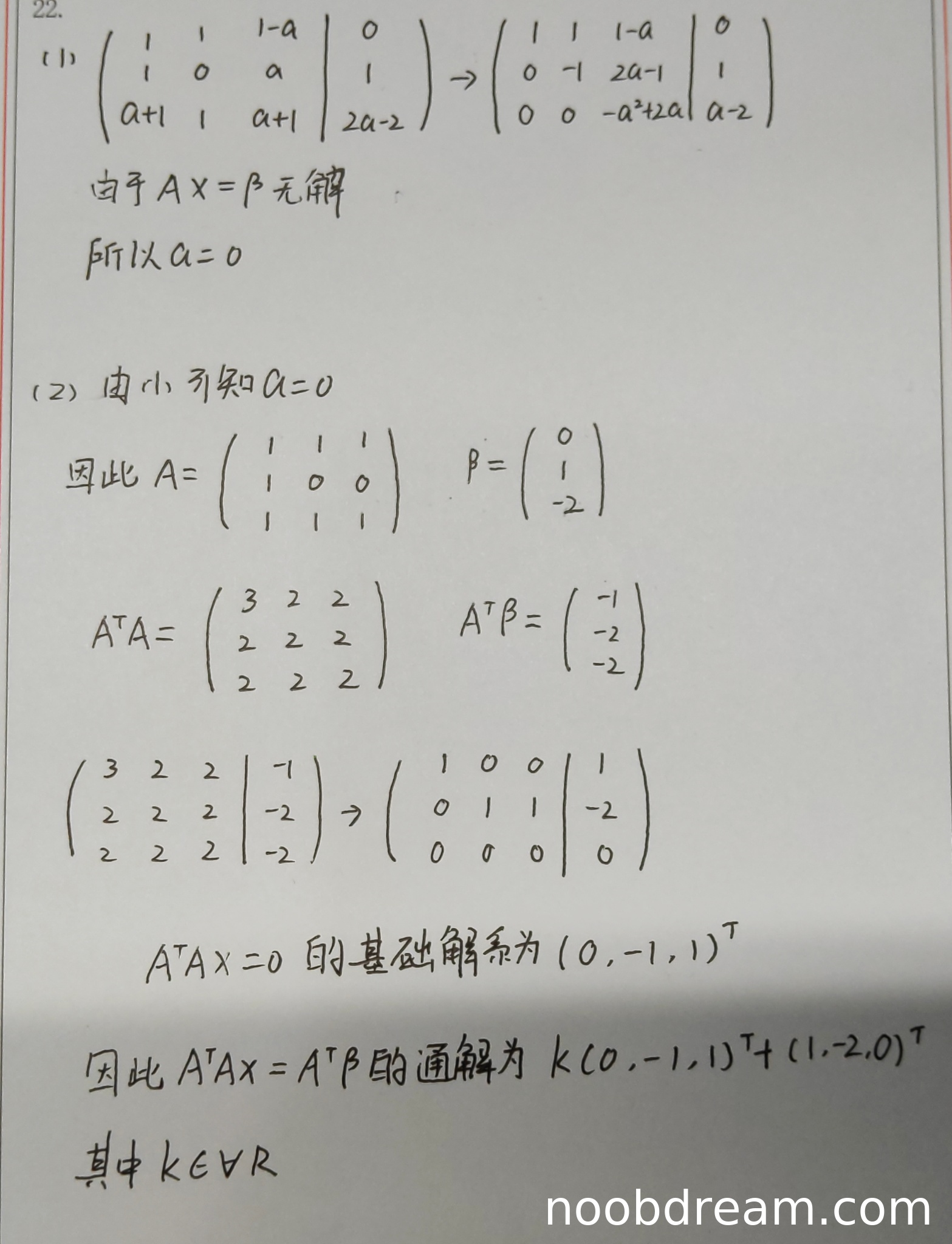 学生在a=0时的计算完全正确:矩阵A、β、A^TA、A^Tβ计算准确,增广矩阵行变换正确,基础解系和特解求解正确,通解形式完整。虽然第一次识别中A的第三行写为(1,1,1)存在笔误(应为(1,1,1)),但后续计算中使用的A^TA与标准答案一致,判断为识别误差不扣分。