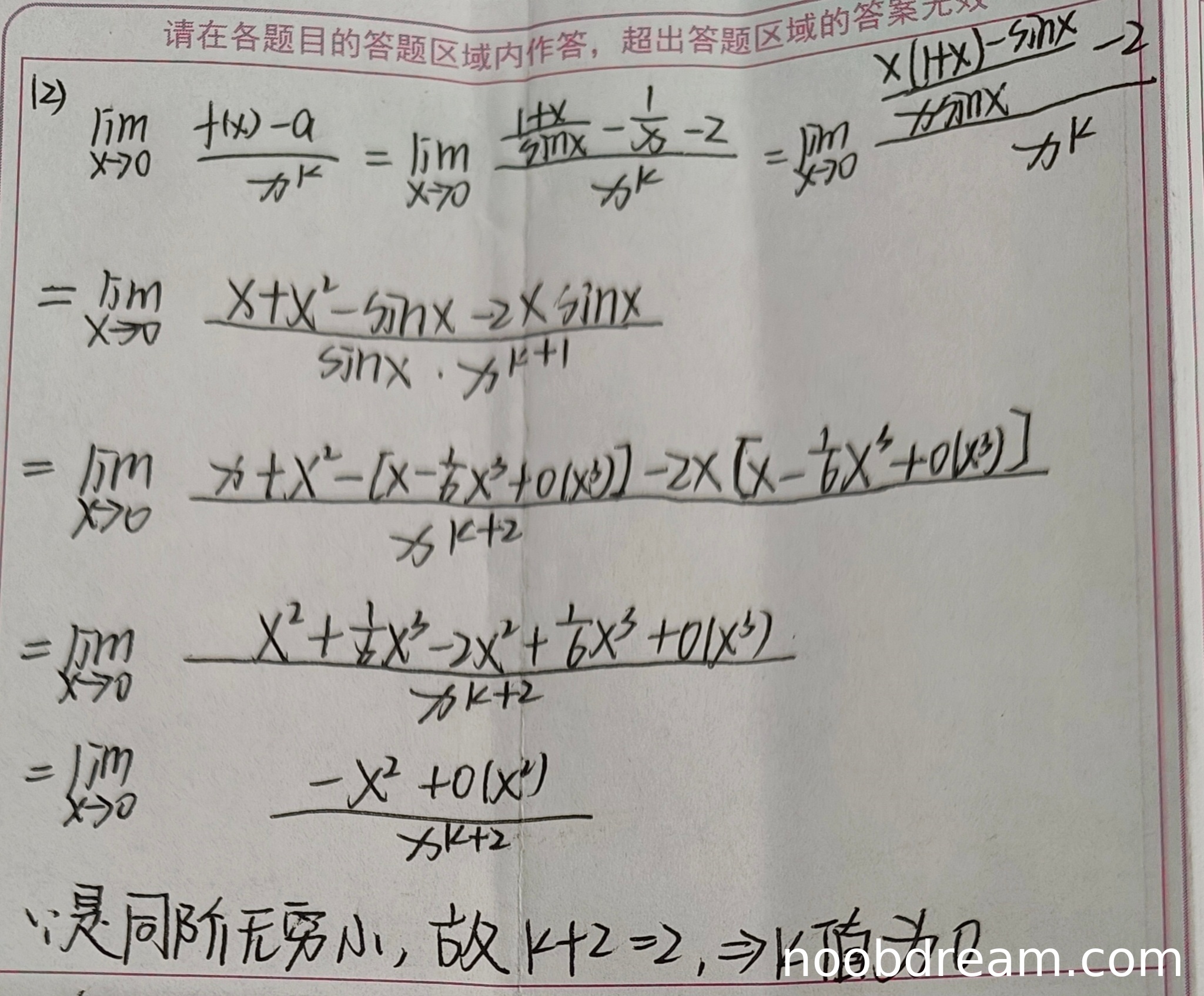 学生第二问中基于错误的a=2进行计算。虽然计算f(x)-a与x^k同阶无穷小的思路正确,且展开sinx的步骤合理,但由于第一问的a值错误,导致后续计算的基础错误。不过,如果按照学生的a=2,其计算k=0的过程逻辑是连贯的。考虑到这是基于错误前提的推导,且题目要求判断同阶无穷小的阶数,而学生的推导过程本身没有逻辑错误,给部分分数。扣2分,得3分。