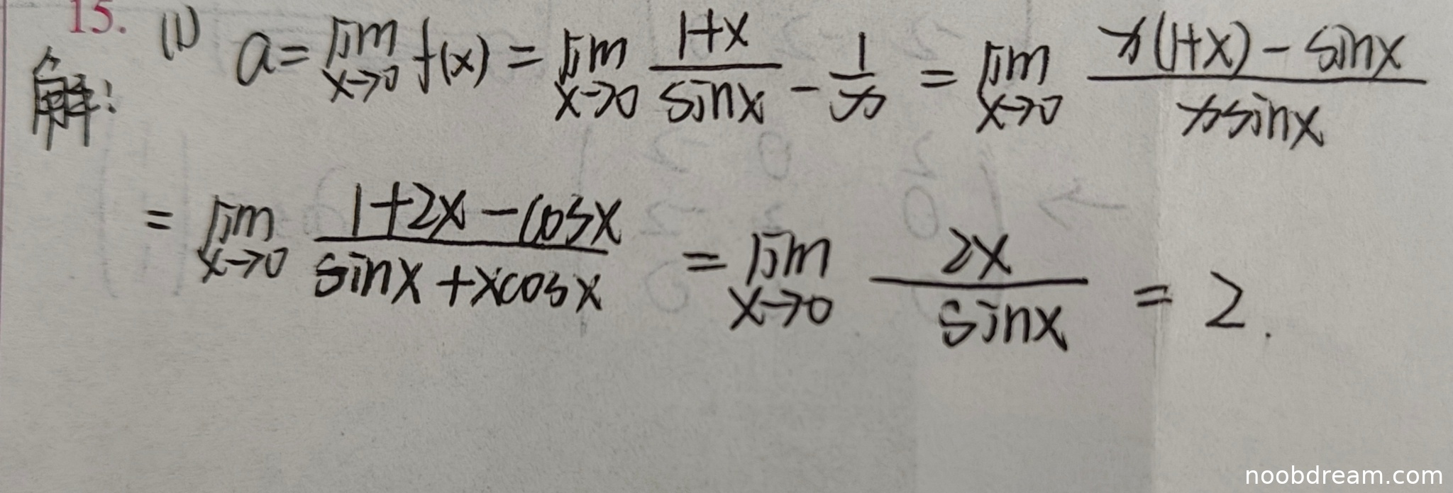 学生第一问中计算a的值时,通过洛必达法则得到a=2,但标准答案为a=1。学生的计算过程存在逻辑错误:在第一次洛必达后,分子为1+2x-cosx,分母为sinx+xcosx,当x→0时,分子→1+0-1=0,分母→0+0=0,确实满足0/0型,可以继续使用洛必达。但第二次洛必达后,分子为2+sinx→2,分母为2cosx-xsinx→2,极限应为1而不是2。学生在第二次洛必达后的计算有误,导致最终结果错误。因此扣3分,得2分。