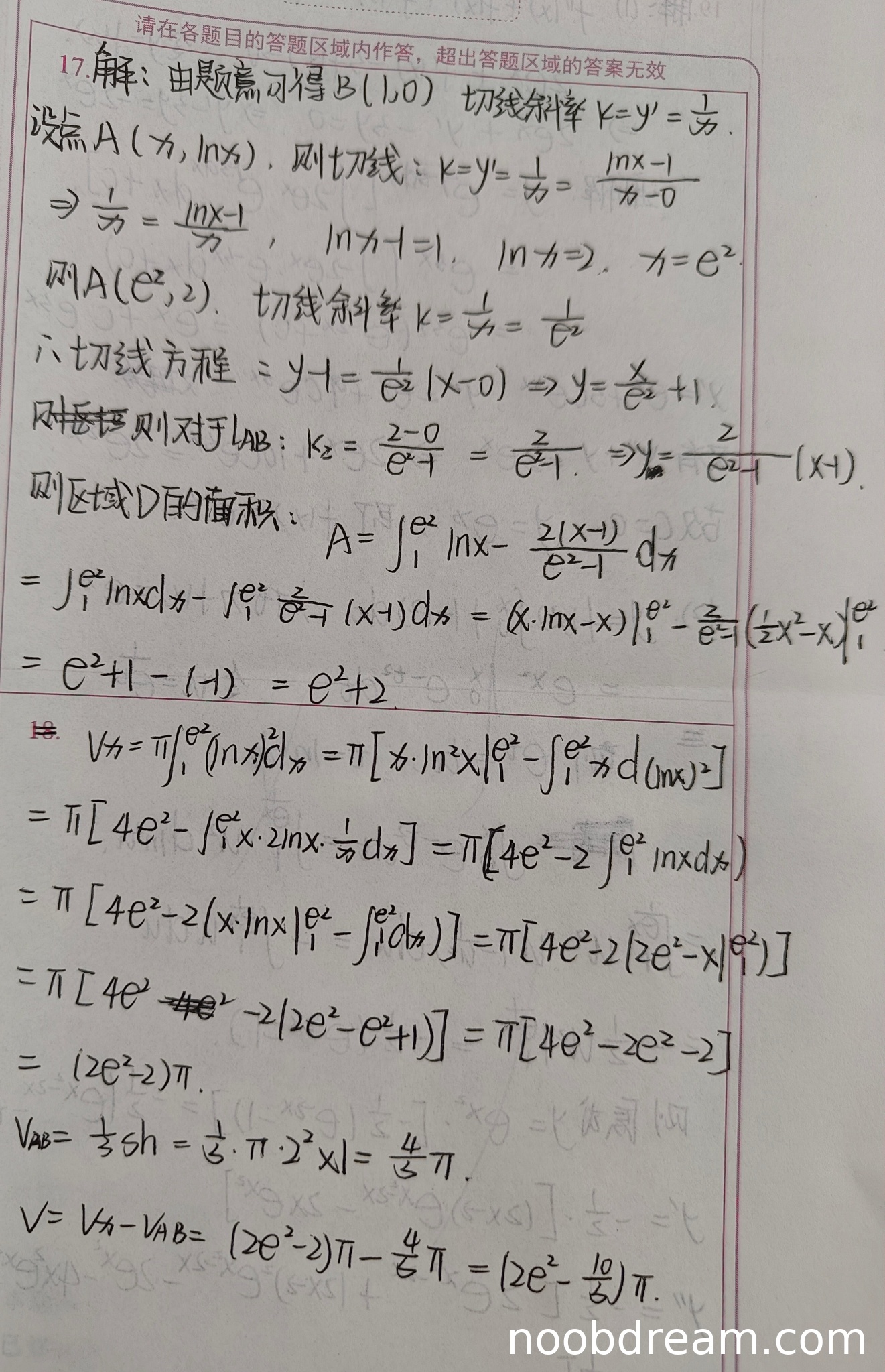 学生计算区域D的面积时,思路正确,积分表达式与标准答案一致:S = ∫₁ᵉ²(ln x - 2(x-1)/(e²-1))dx。但在计算过程中出现错误: