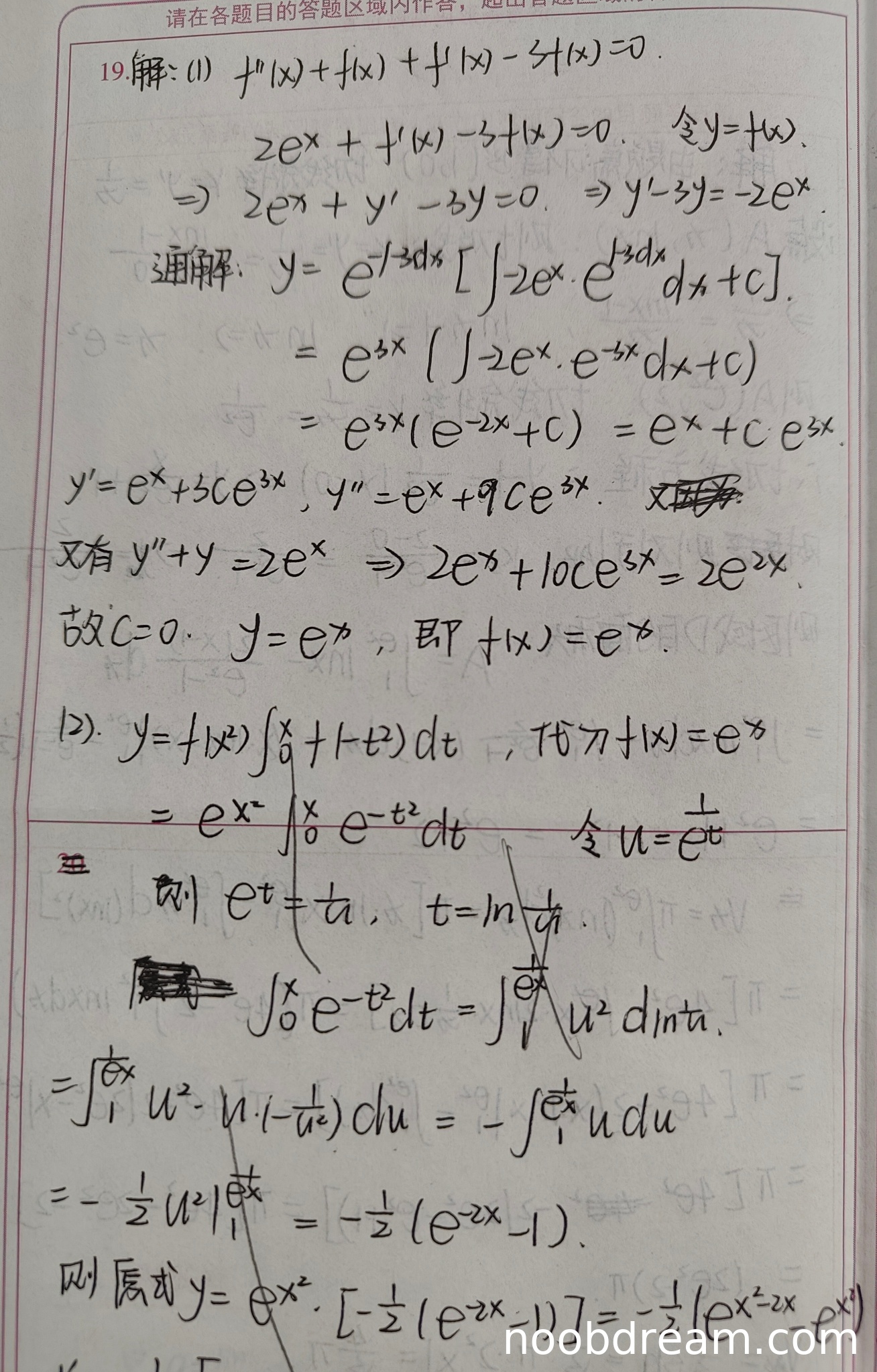 学生作答中,第1次识别结果中,第一步将原方程写为 \(f''(x)+f(x)+f'(x)-3f(x)=0\),这实际上是对题目中两个方程的错误组合(应为 \(f''(x)+f'(x)-2f(x)=0\) 和 \(f''(x)+f(x)=2e^x\) 分别处理)。但学生后续通过一阶线性微分方程求解,并利用第二个方程确定常数,最终得到正确结果 \(f(x)=e^x\)。虽然初始方程组合有误,但求解过程和最终结果正确,且思路与标准答案不同但合理。根据评分要求“思路正确不扣分”,且核心逻辑正确,因此不扣分。但初始方程书写错误属于逻辑错误,应扣1分。得分为4分。