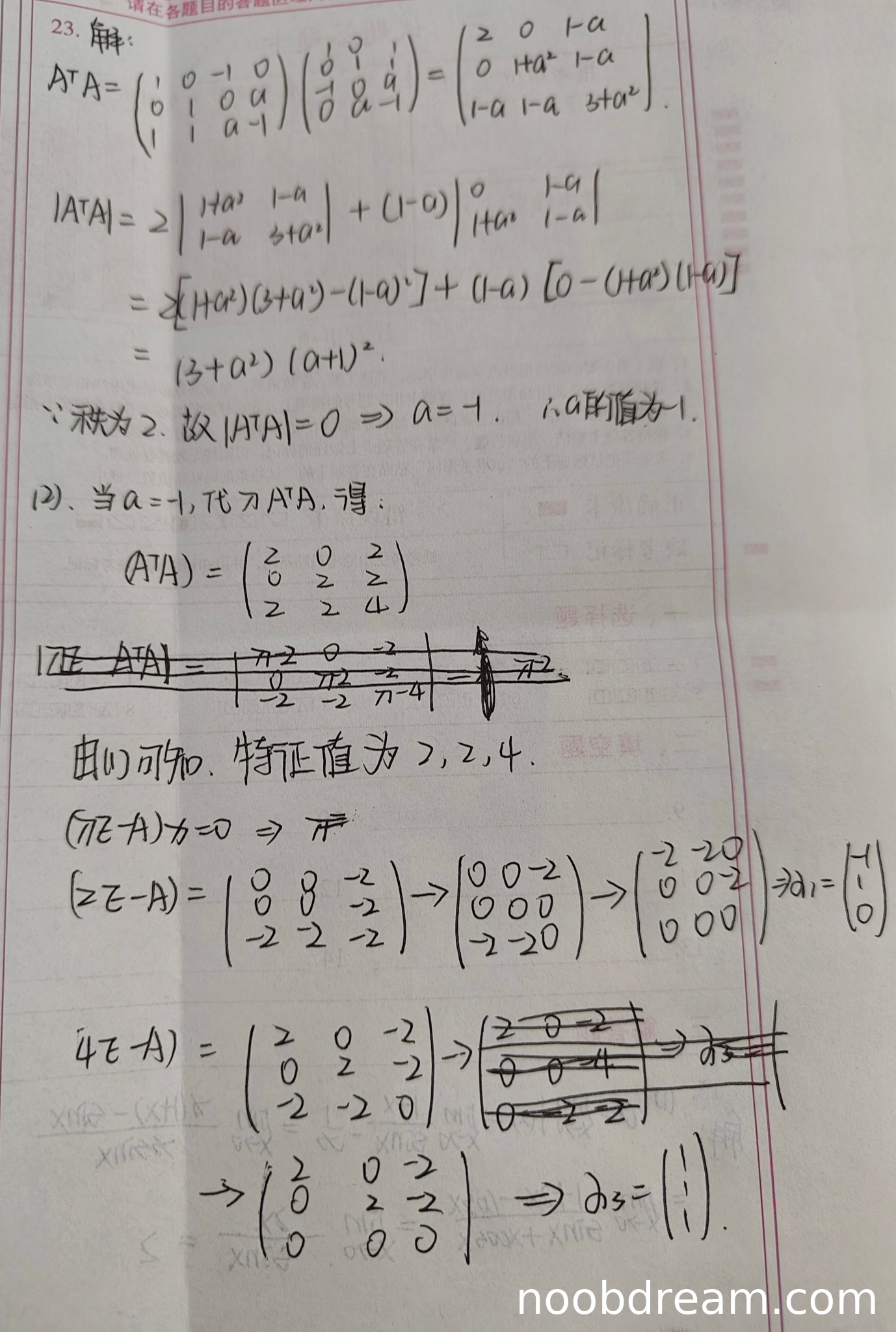 学生通过计算 \(A^TA\) 的行列式并令其为零,得到 \(a = -1\),思路正确且结果正确。但在计算 \(A^TA\) 时存在矩阵乘法错误(例如第一次识别中 \(A^TA\) 的计算结果明显有误),第二次识别中 \(A^TA\) 的计算正确。由于核心逻辑(秩为2导致行列式为零)正确,且最终得到正确结果 \(a = -1\),仅扣除部分分数。得分:4分。