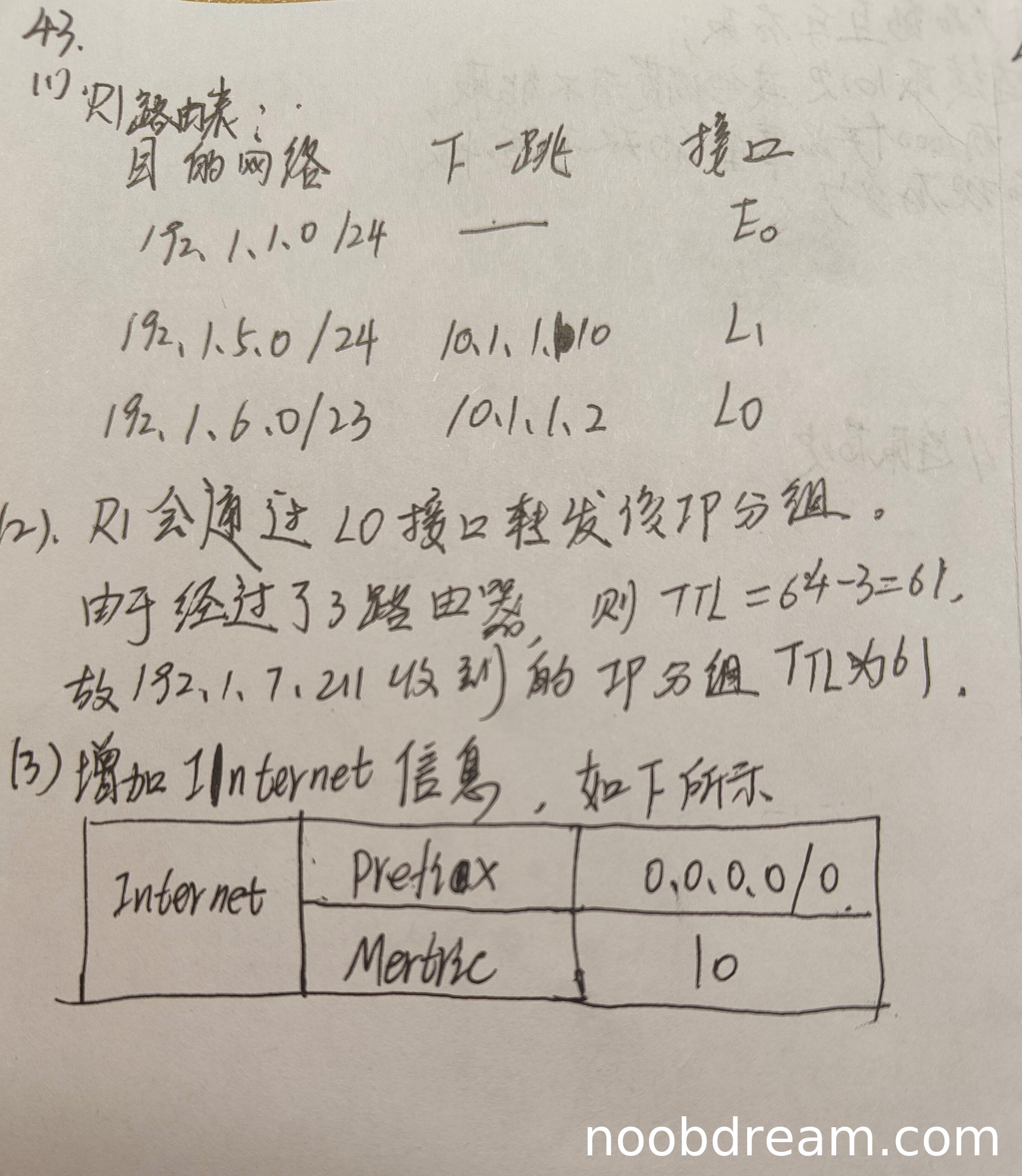 学生正确指出R1通过L0接口转发该IP分组(1分)。对于TTL计算,学生回答经过3个路由器后TTL=64-3=61,与标准答案一致(1分)。虽然第二次识别结果中目标IP地址误写为"192.1.7.21"(应为192.1.7.211),但根据上下文判断为识别错误,不扣分。因此得2分。