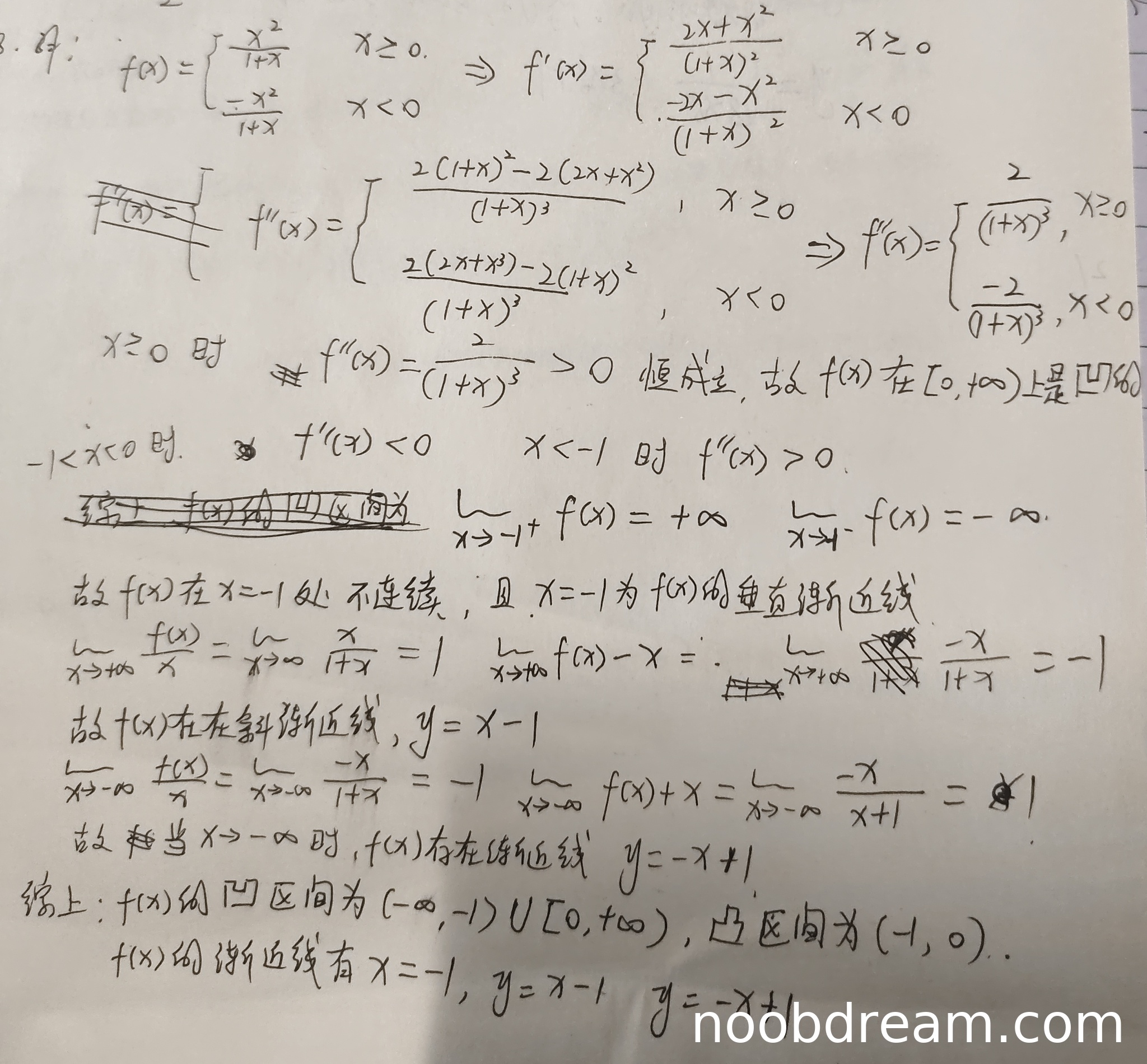 学生正确分段求出了二阶导数,并正确判断了各区间二阶导数的符号。凹区间给出为(-∞,-1)∪[0,+∞),凸区间为(-1,0)。与标准答案相比,凹区间在0点处写成了闭区间[0,+∞),而标准答案是开区间(0,+∞)。考虑到函数在x=0处二阶导数不存在,应该用开区间表示,这是一个逻辑错误。扣1分。