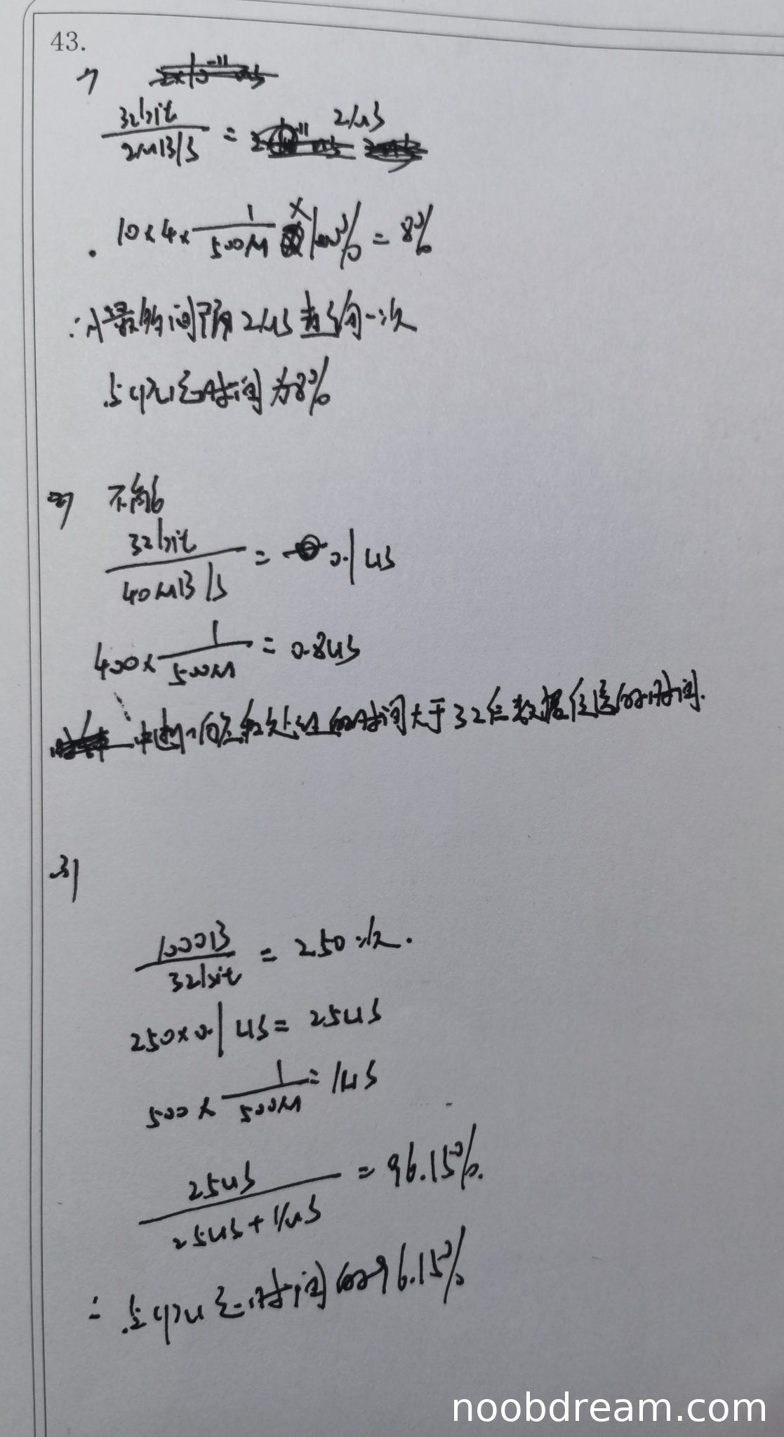 学生计算DMA次数为250次(1000B/32bit),但标准答案为40000次(40MB/1000B)。学生错误地将数据块大小与接口寄存器大小相除,而不是设备传输率与数据块大小相除,这是根本性的逻辑错误。后续基于错误次数计算的时间占比96.15%也不正确。因此本小题得0分。
