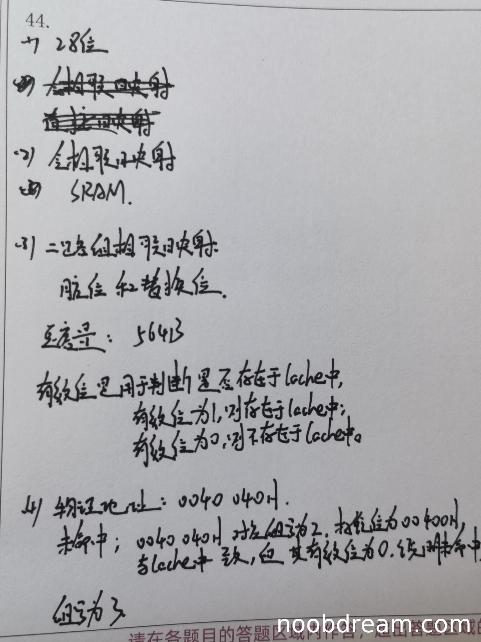 第一问:学生回答物理地址为“0040 040H”,与标准答案“0040040H”一致(可能为书写格式差异),得1分。第二问:学生回答“未命中”,正确;理由部分提到“标记位为00400H,与cache中一致,但其有效位为0,说明未命中”,逻辑正确,得2分。第三问:学生回答“组号为3”,正确,得2分。本小题共得5分。
