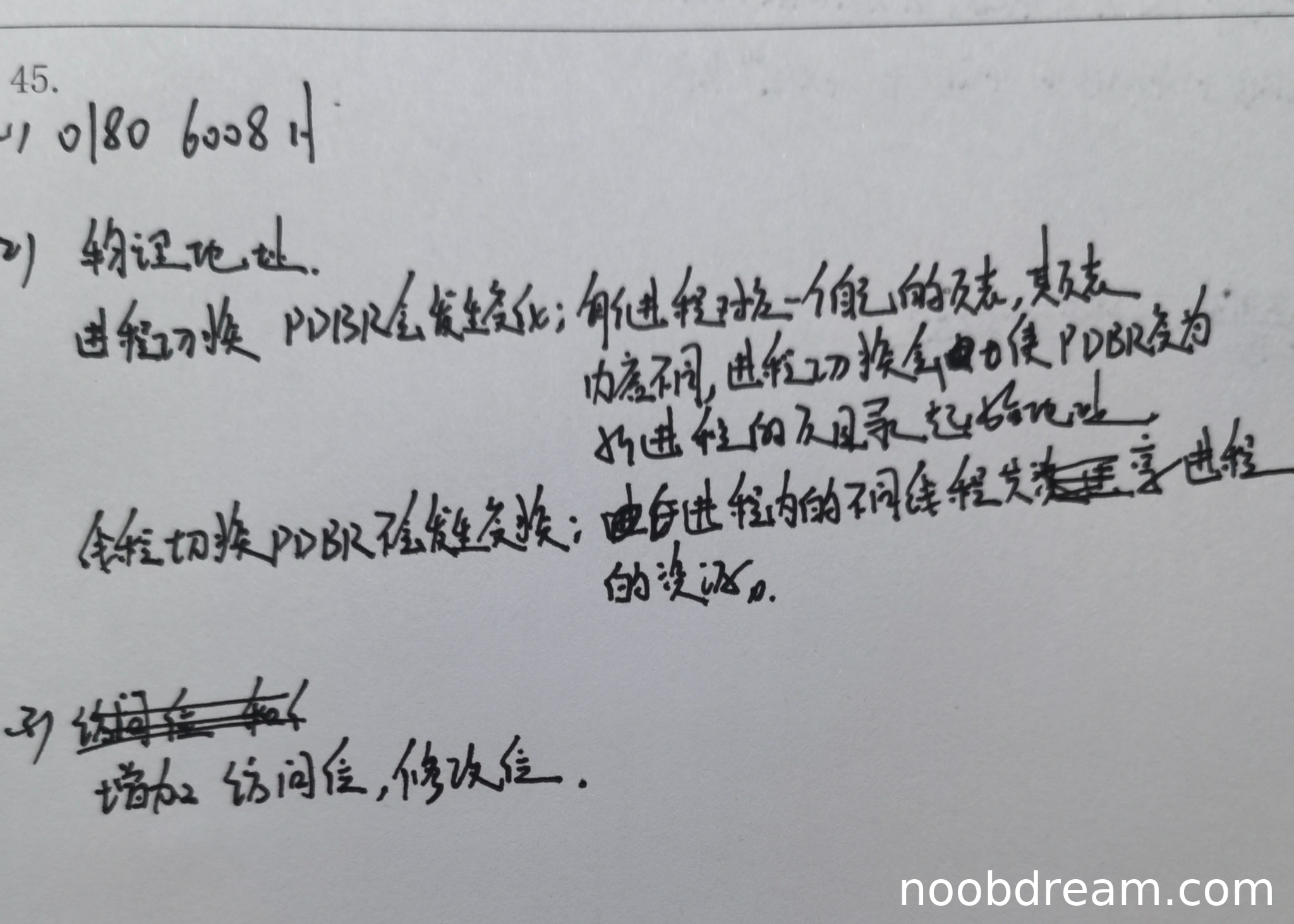第二问:学生正确回答"进程切换PDBR会发生变化",并给出合理理由"每个进程有一个自己的页表,页表内容不同",得1分。