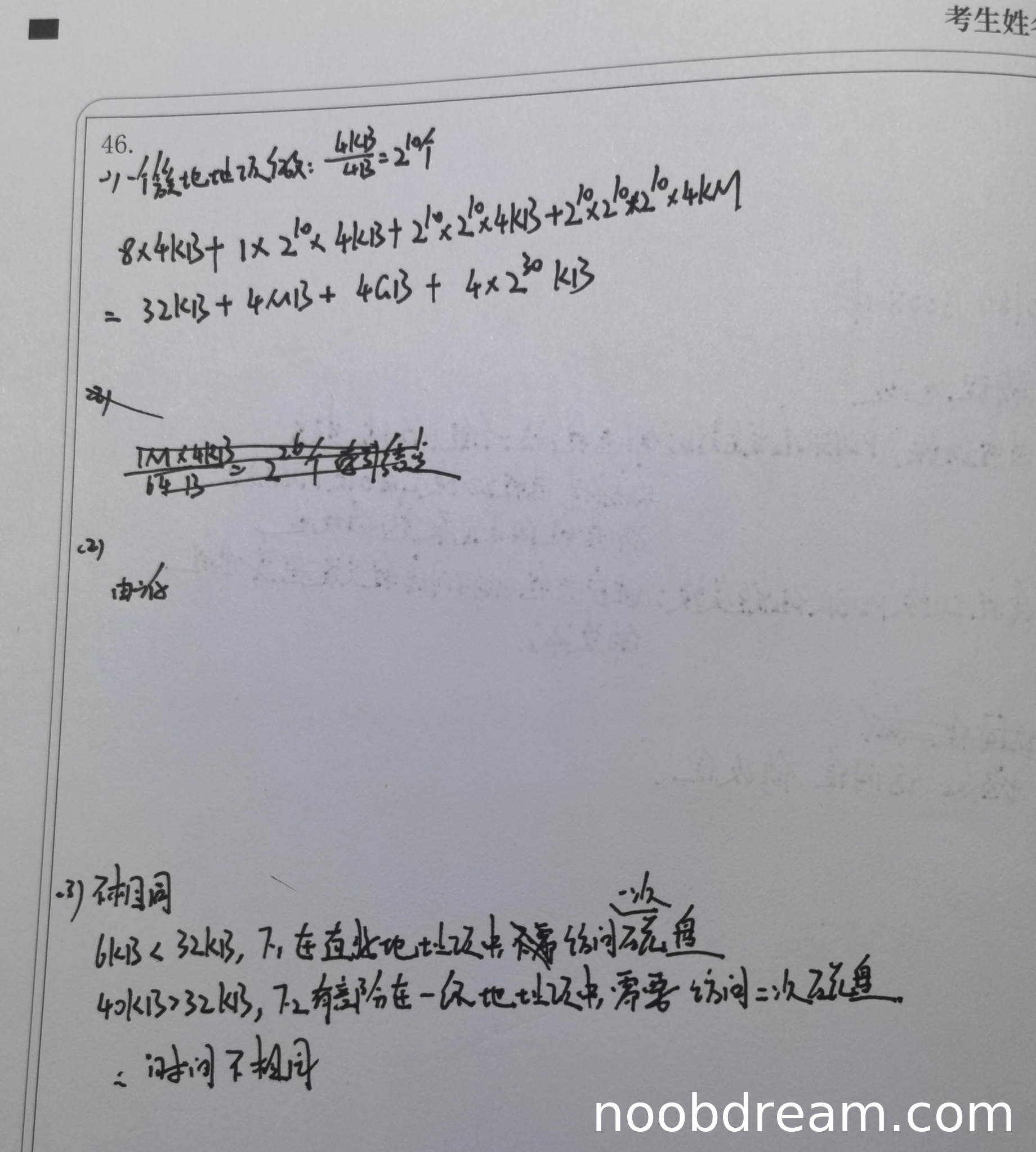 学生作答中给出了计算表达式,正确计算了每簇地址项数为1024个,并按照直接、一级、二级、三级间接地址项的结构进行了计算。但存在以下问题: