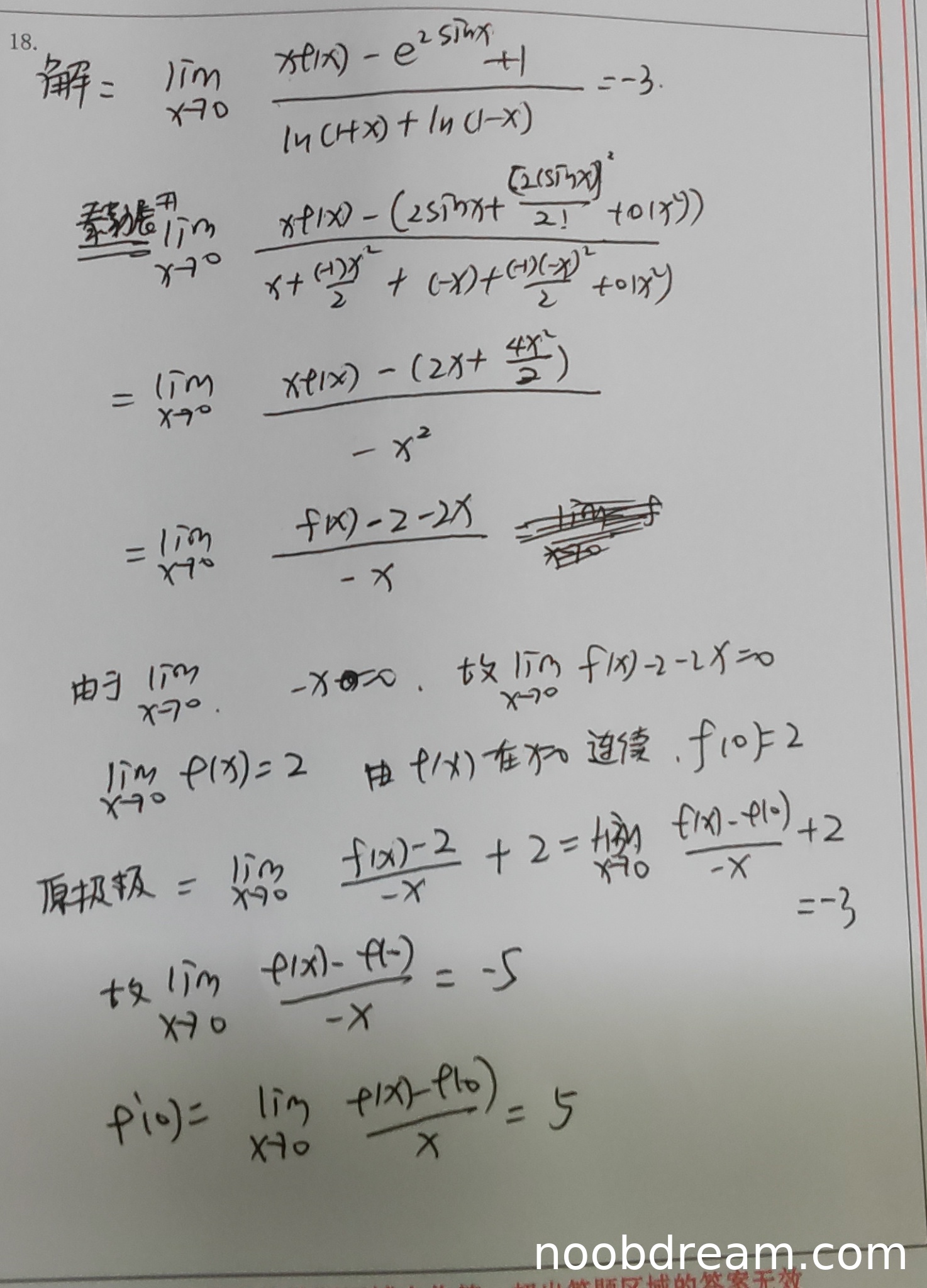 学生正确地计算了分母的等价无穷小:ln(1+x)+ln(1-x) = -x²+o(x²),得1分。