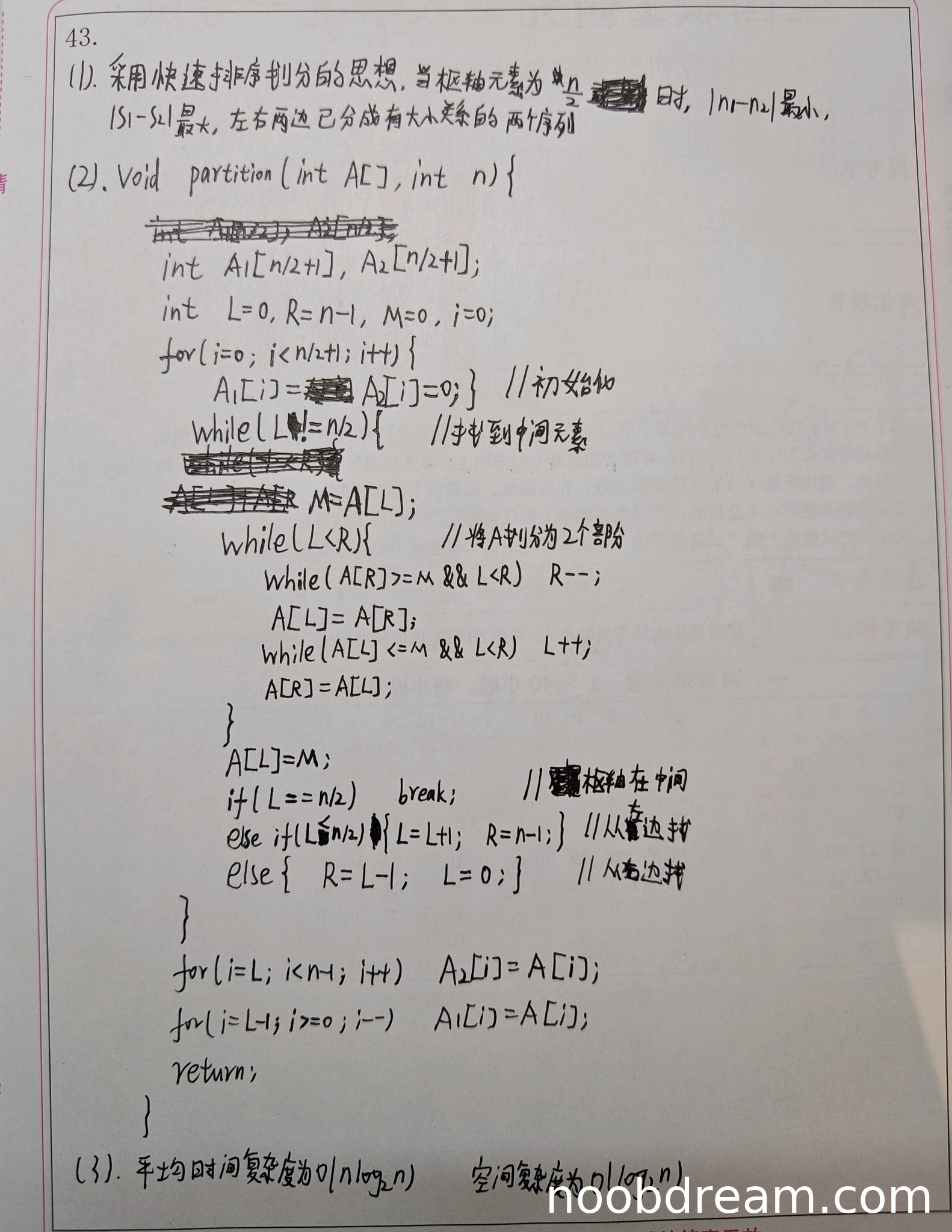 理由:学生基本理解了使用快速排序划分思想来解决问题,提到了当枢轴元素为n/2时能满足题目要求。但没有明确说明具体划分策略(找到第⌊n/2⌋小的元素),也没有完整描述三种情况的处理(i=⌊n/2⌋、i<⌊n/2⌋、i>⌊n/2⌋时的不同处理),因此扣1分。
