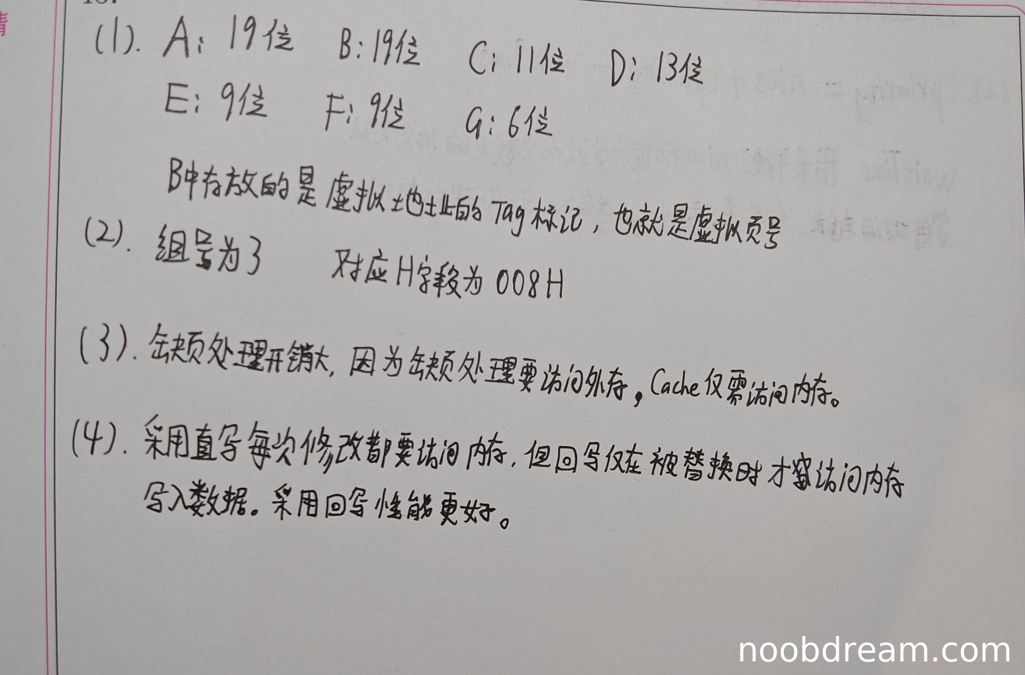 对于TLB标记字段B的内容,学生回答"虚拟页号",与标准答案"虚页号"含义一致,得1分。
