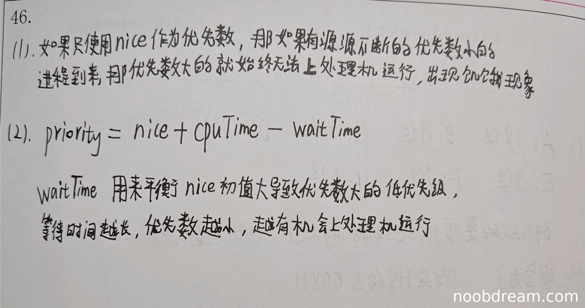 学生正确解释了为什么只使用nice作为优先数会导致饥饿现象:当有源源不断的优先数小的进程到来时,优先数大的进程始终无法运行。这与标准答案中"当就绪队列中总有优先数较小的进程时,优先数较大的进程一直没有机会运行"的核心思想一致。得2分。