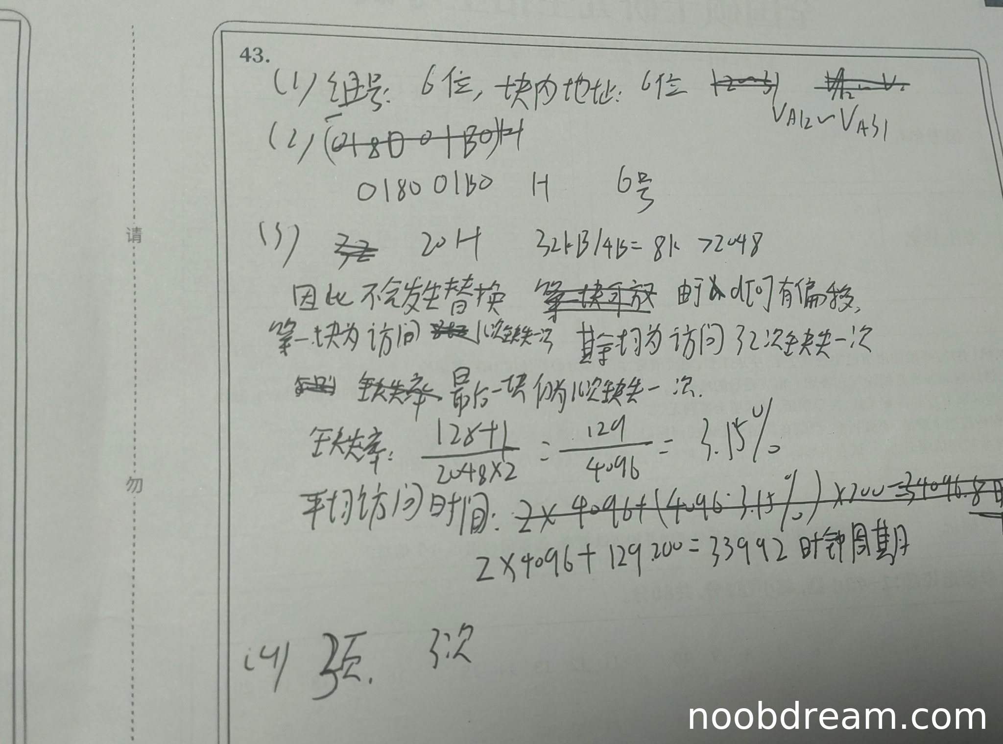 学生正确回答了d[0]在其所在主存块内的偏移量为20H,得1分;正确计算出Cache缺失率为3.15%,得2分;但在平均访问时间的计算中,学生使用了错误的方法(2×4096+129×200=33992时钟周期),这实际上计算的是总访问时间而非平均访问时间,标准答案要求计算平均访问时间(2+200p=8.3个时钟周期),因此扣2分。得3分。