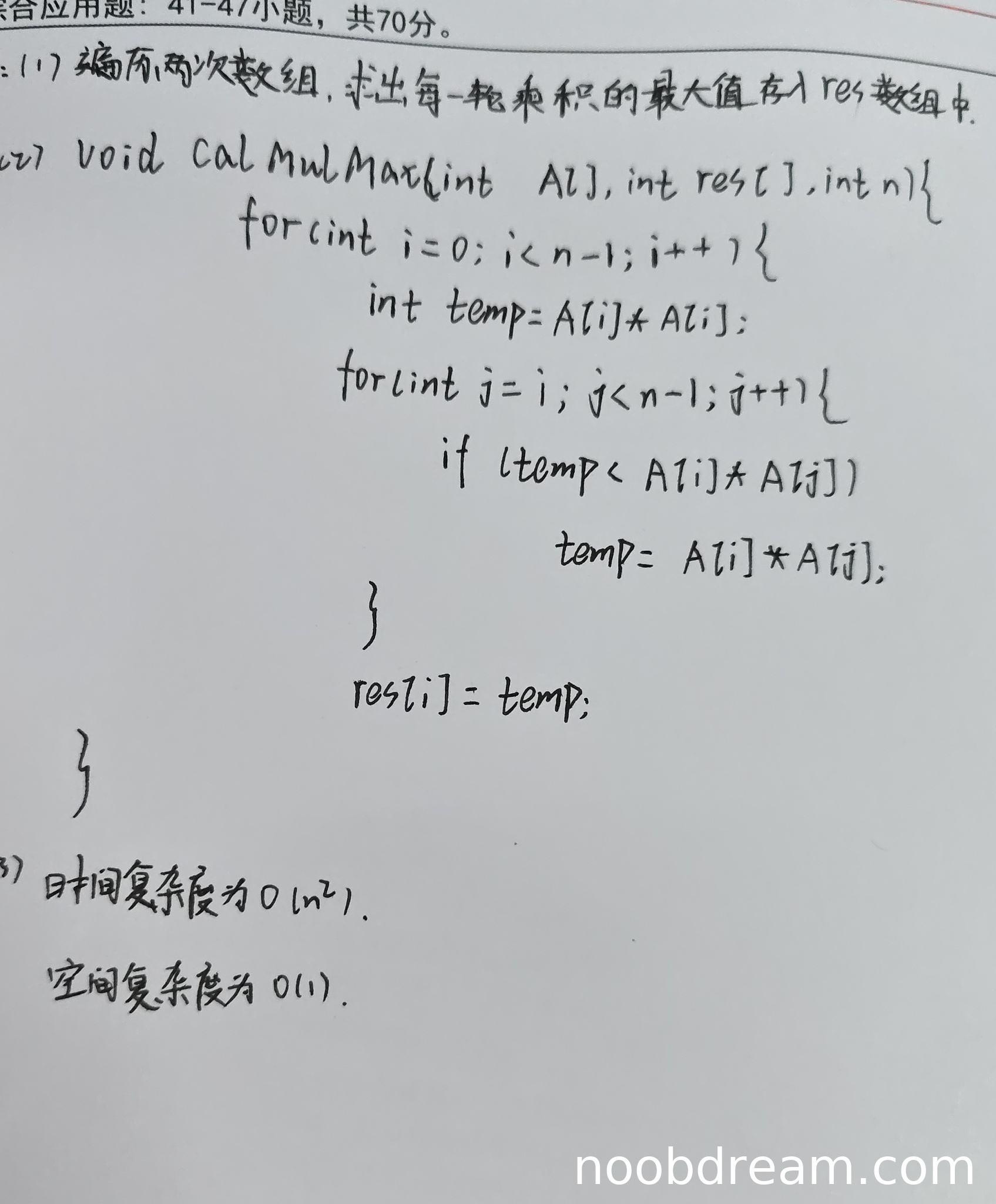 学生作答中给出的基本设计思想是"遍历两次数组,求出每一轮乘积的最大值存入res数组中",这描述了一种暴力解法。虽然思路正确,但未能达到题目要求的"时间和空间上尽可能高效"的标准。标准答案采用了O(n)时间复杂度的算法,而学生的暴力解法时间复杂度为O(n²),效率较低。因此扣2分,得2分。