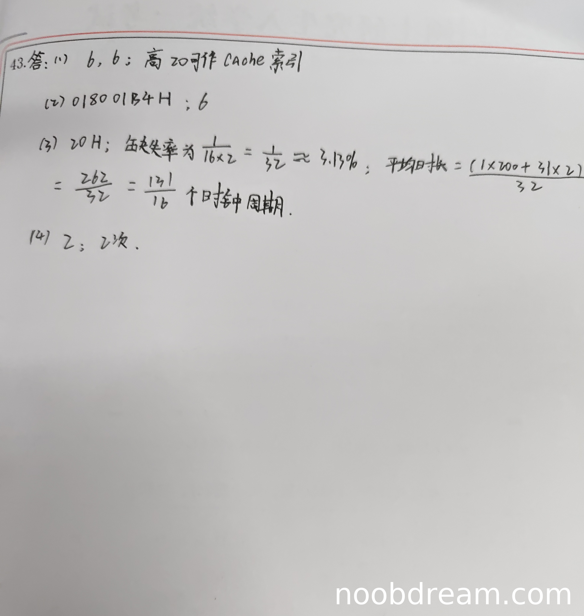 学生答案:d[0]所在主存块内偏移量20H正确(因d[0]地址0180 0020H,低6位为块内地址,即0x20);缺失率计算为1/(16×2)=1/32≈3.13%错误(标准计算应为129次缺失/4096次访问≈3.15%,学生未考虑数组跨越129个主存块);平均访问时间计算中,分子使用200和2(但第二次识别写300可能是笔误,按第一次识别200计算),但基于错误缺失率计算,结果错误。偏移量正确得1分,缺失率错误扣2分,平均访问时间错误扣1分。本小题得2分。